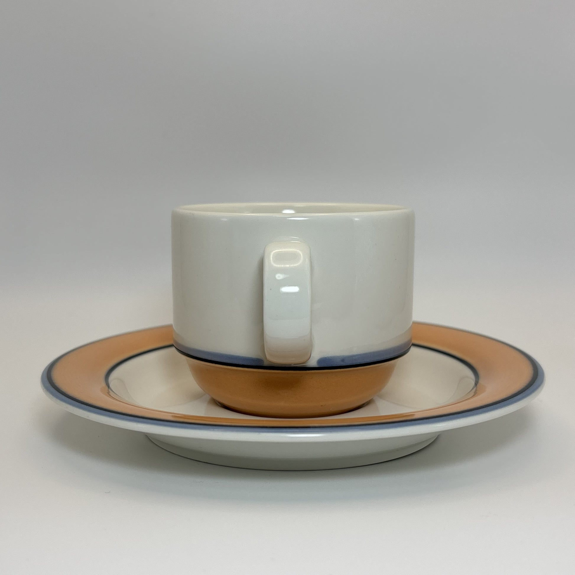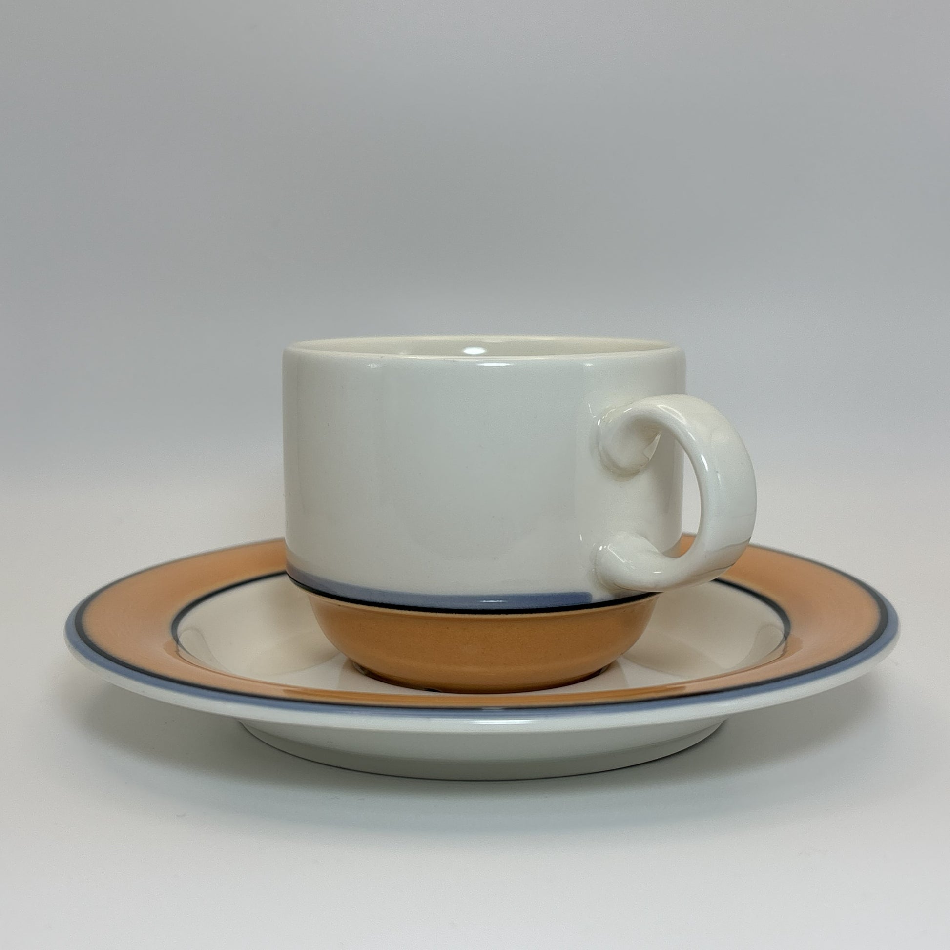 シンプルかつ端正なカップフォルムに、ソーサーのリムやカップ底部に配された淡い杏色の帯が、やわらかい春の光を思わせる佇まいを演出します。