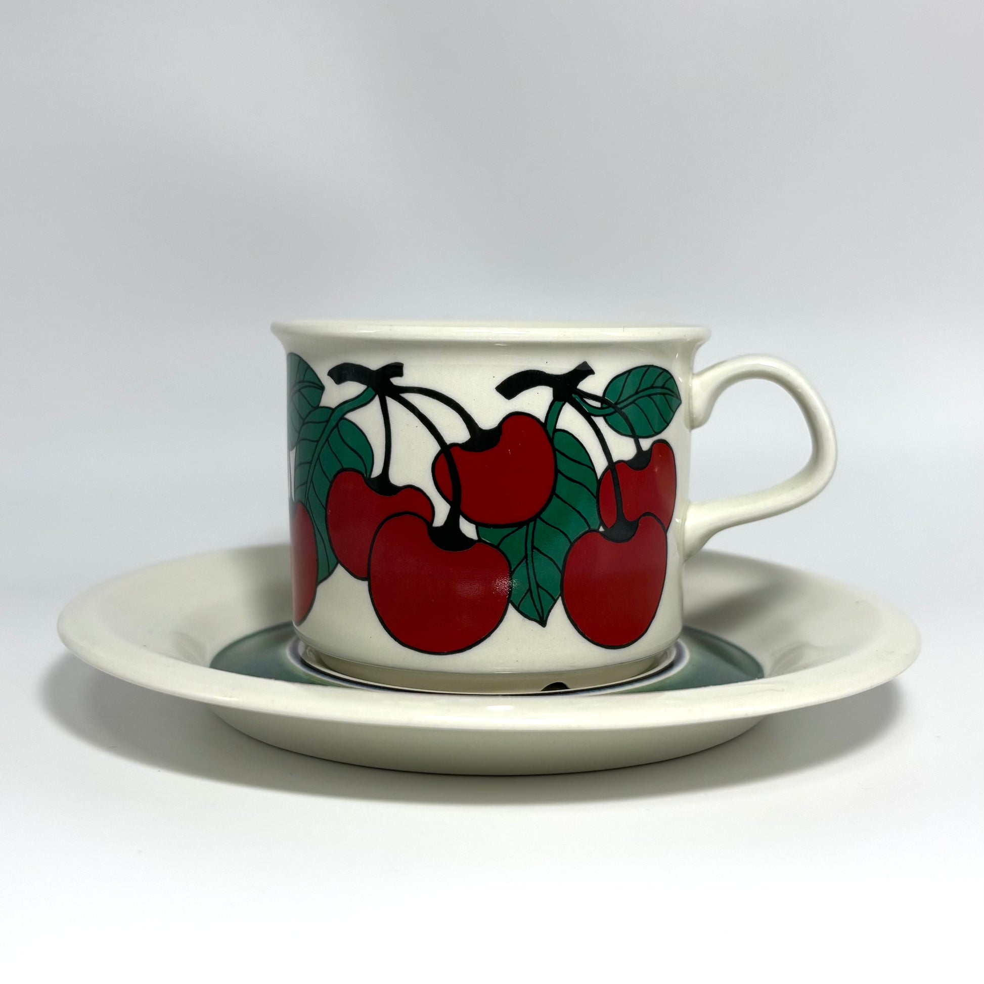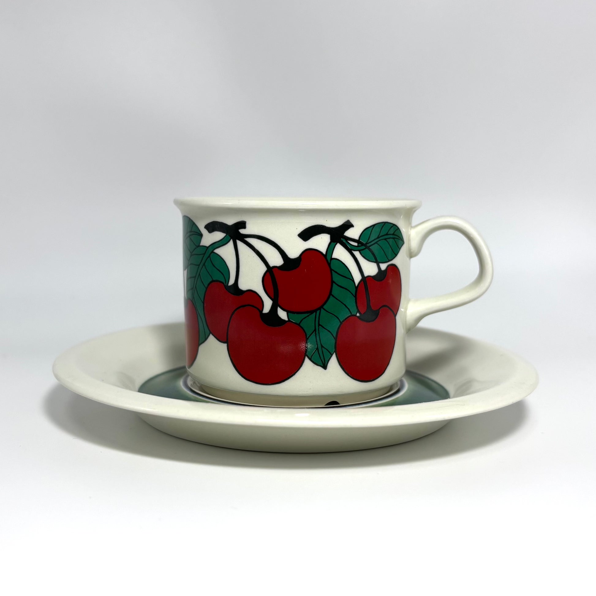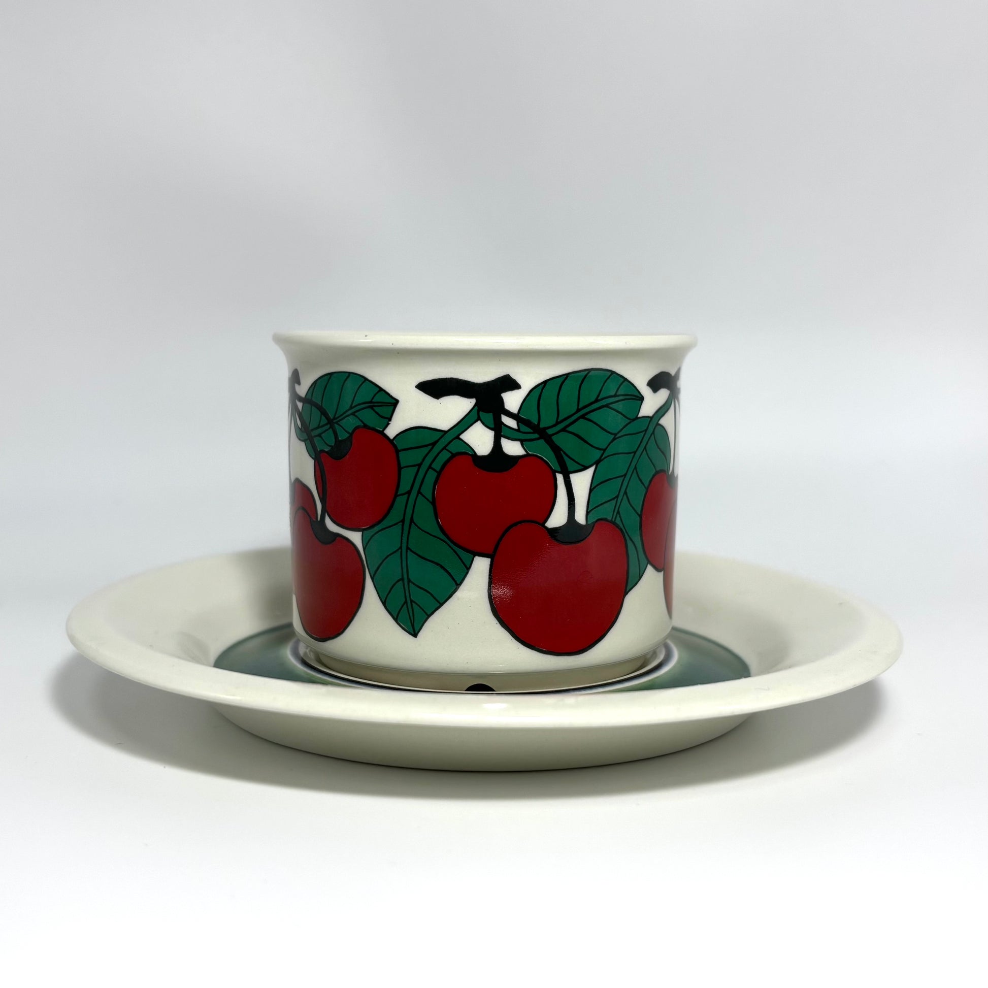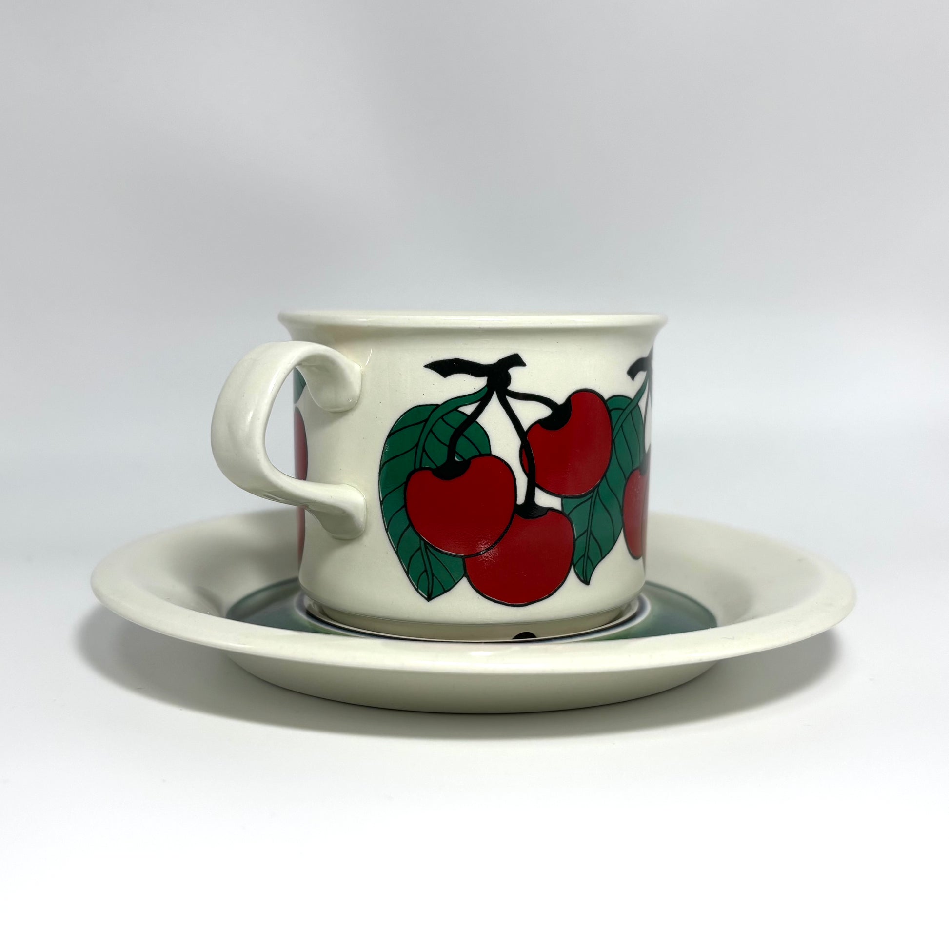 1970年代にARABIA(アラビア)で製造された、鮮やかで愛らしいデザインの 「Kirsikka(キルシッカ)」 シリーズ。フィンランド語で “さくらんぼ” を意味するその名の通り、深いレッドのチェリーと瑞々しいグリーンの葉が大胆に描かれ、北欧ヴィンテージの中でも特に人気の高いコレクションです。