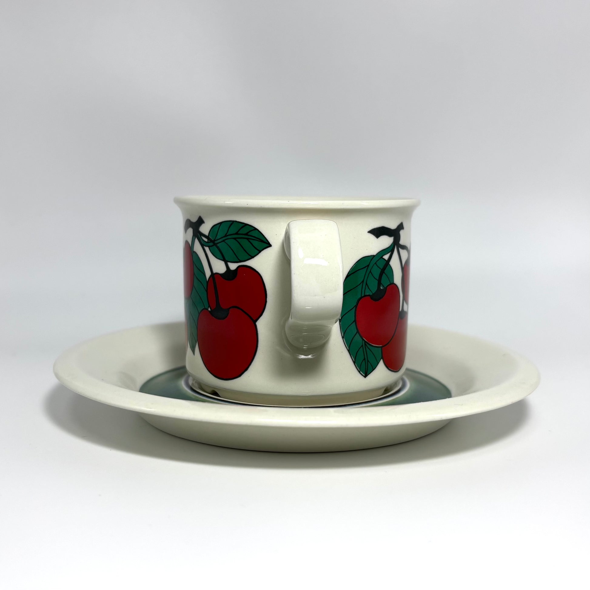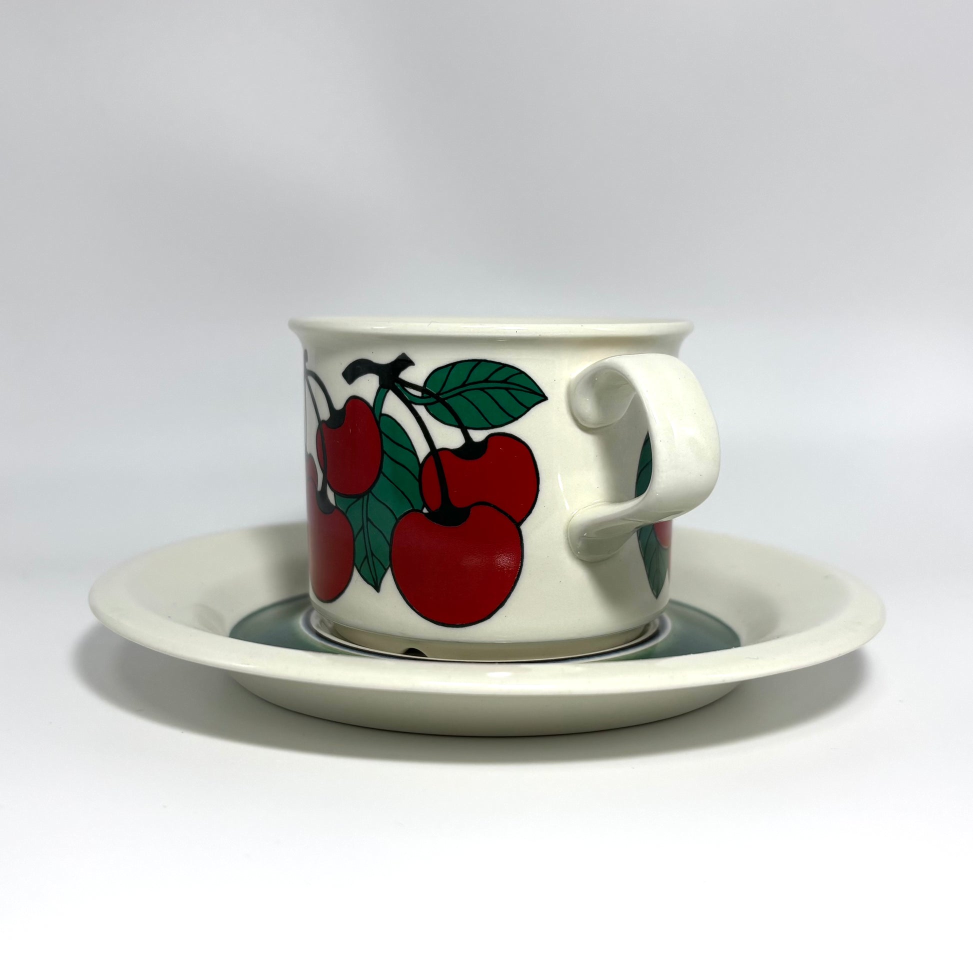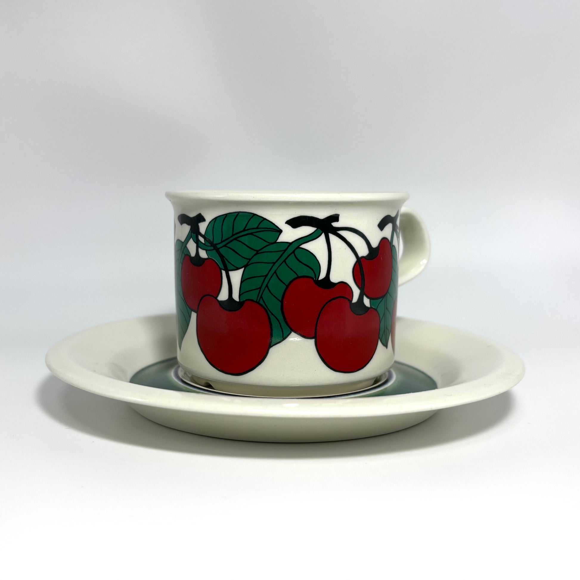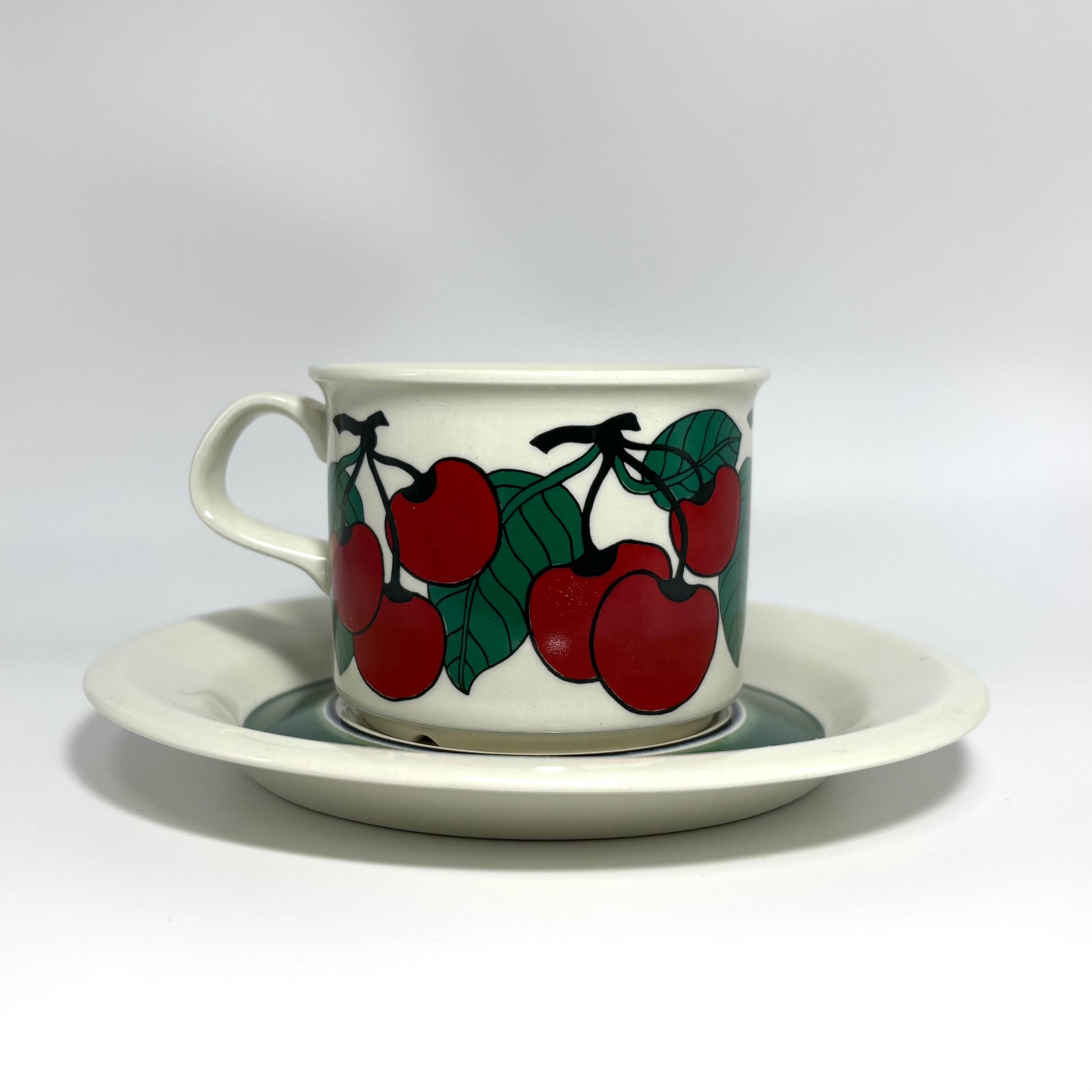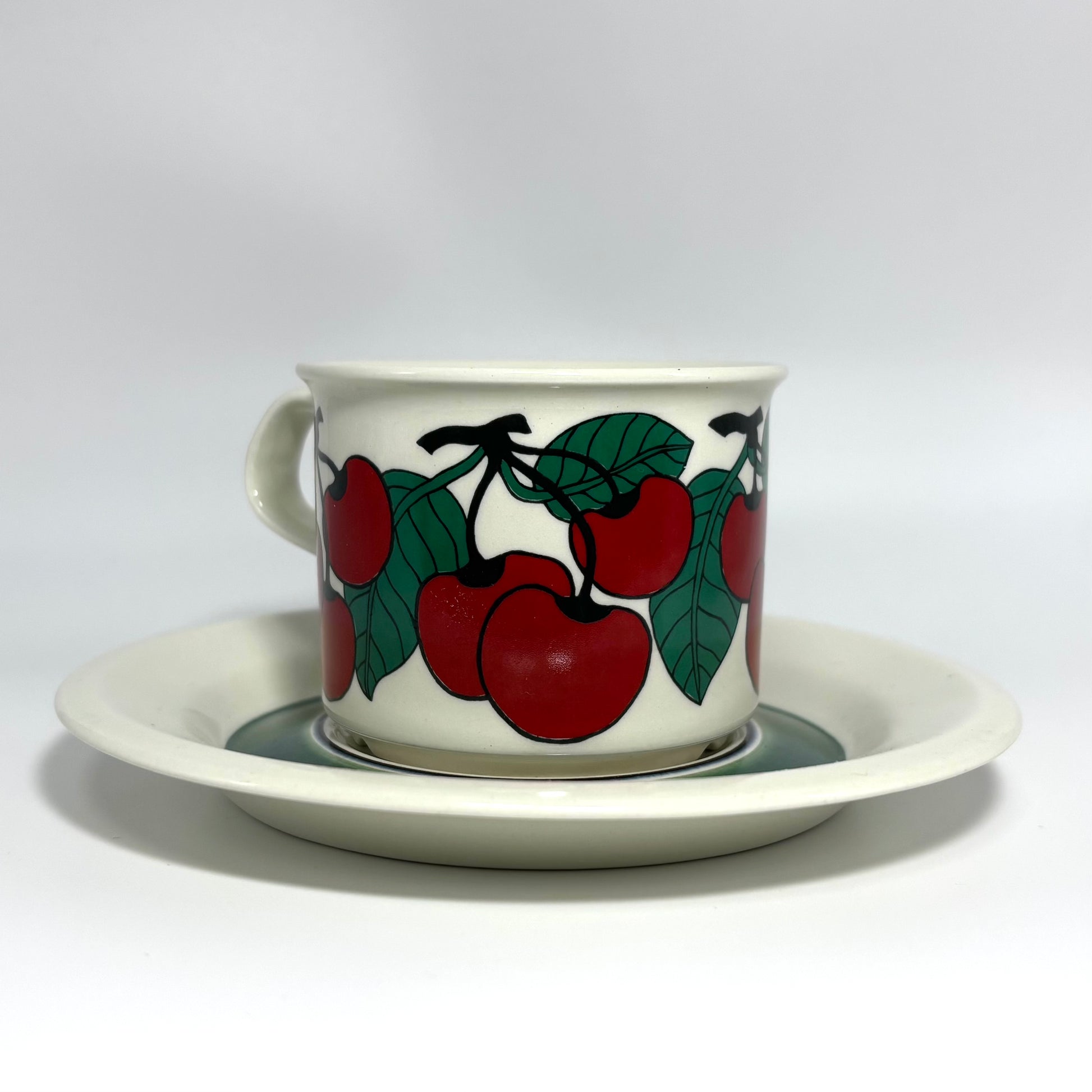 1970年代にARABIA(アラビア)で製造された、鮮やかで愛らしいデザインの 「Kirsikka(キルシッカ)」 シリーズ。フィンランド語で “さくらんぼ” を意味するその名の通り、深いレッドのチェリーと瑞々しいグリーンの葉が大胆に描かれ、北欧ヴィンテージの中でも特に人気の高いコレクションです。