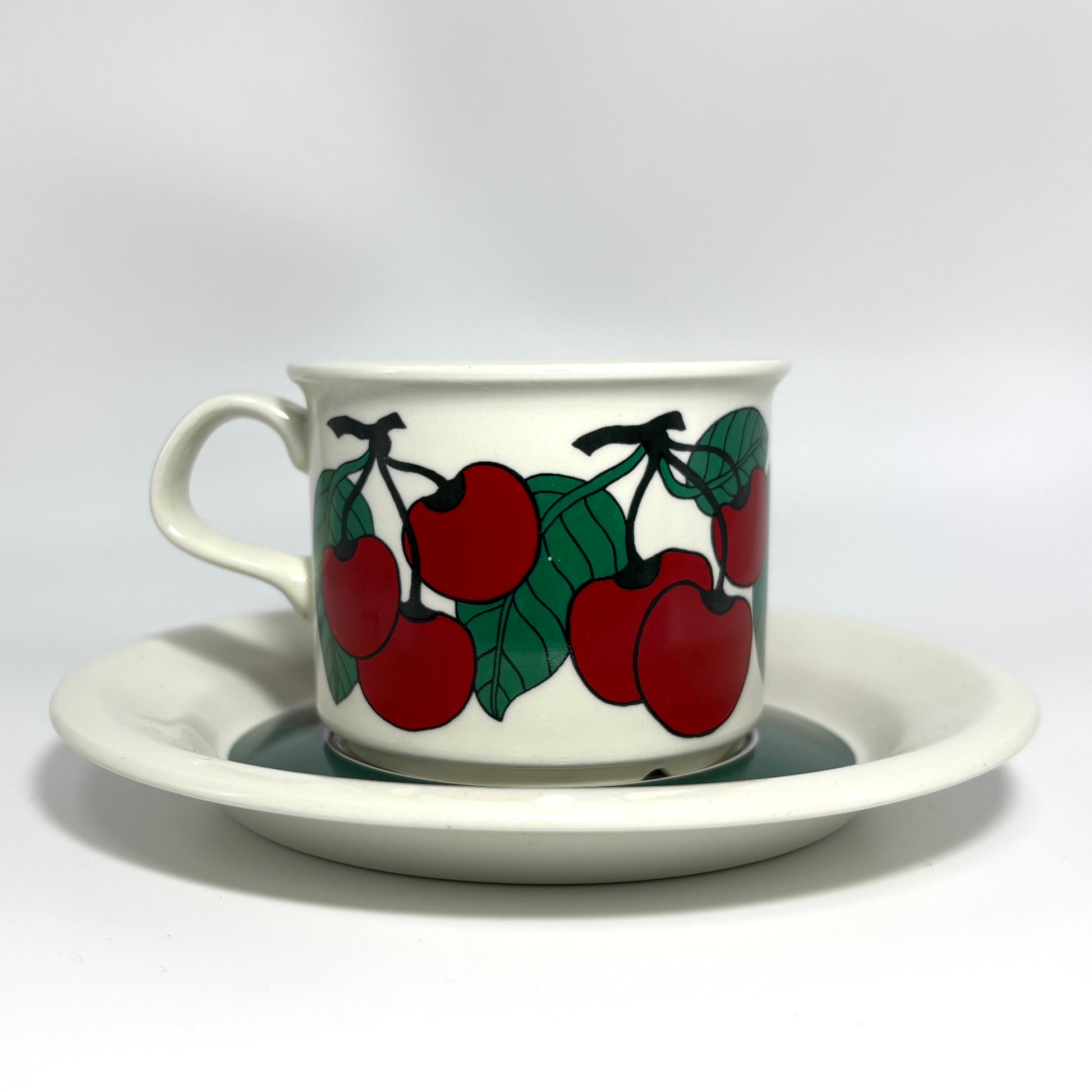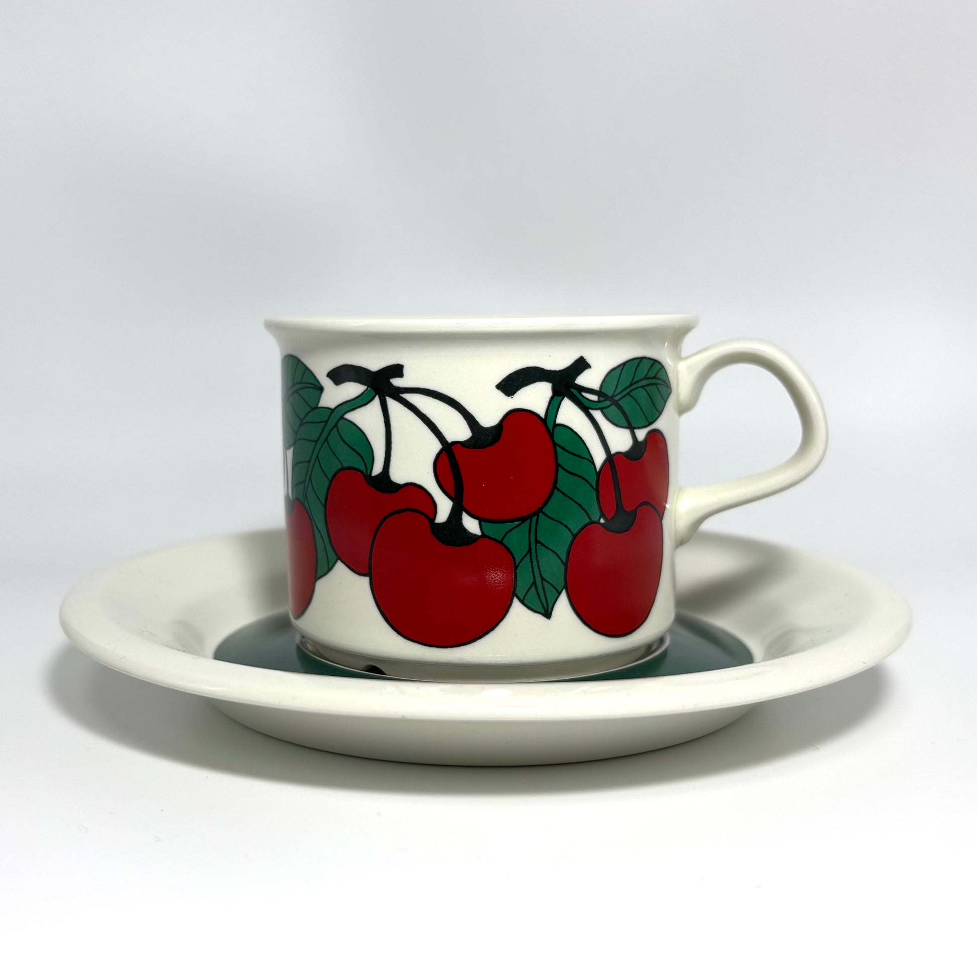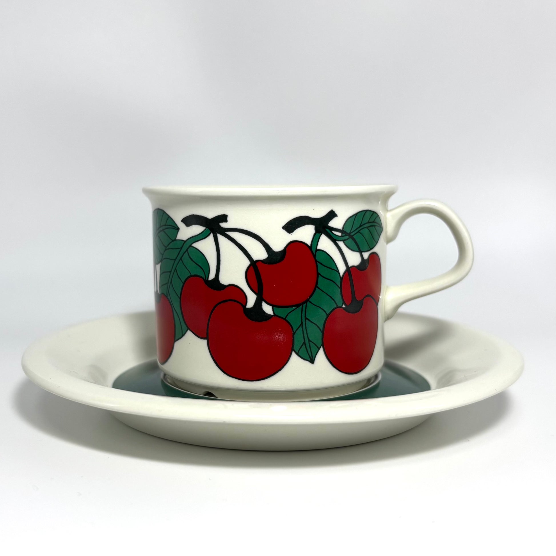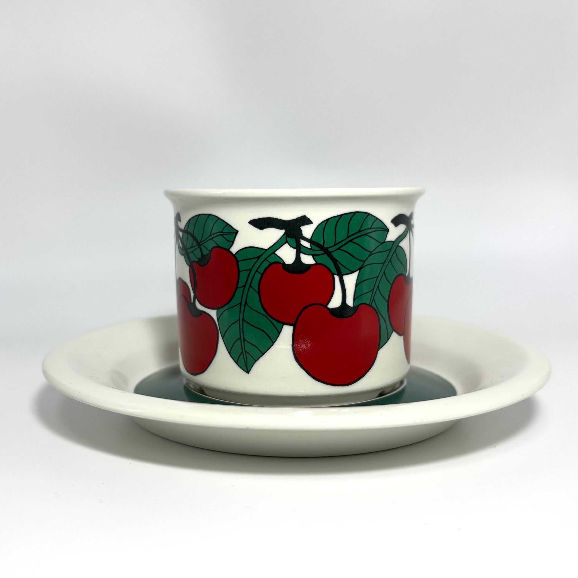 1970年代にARABIA(アラビア)で製造された、鮮やかで愛らしいデザインの 「Kirsikka(キルシッカ)」 シリーズ。フィンランド語で “さくらんぼ” を意味するその名の通り、深いレッドのチェリーと瑞々しいグリーンの葉が大胆に描かれ、北欧ヴィンテージの中でも特に人気の高いコレクションです。