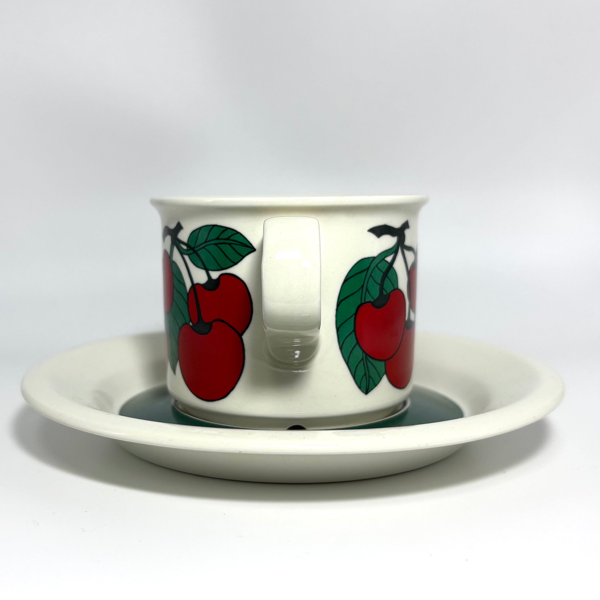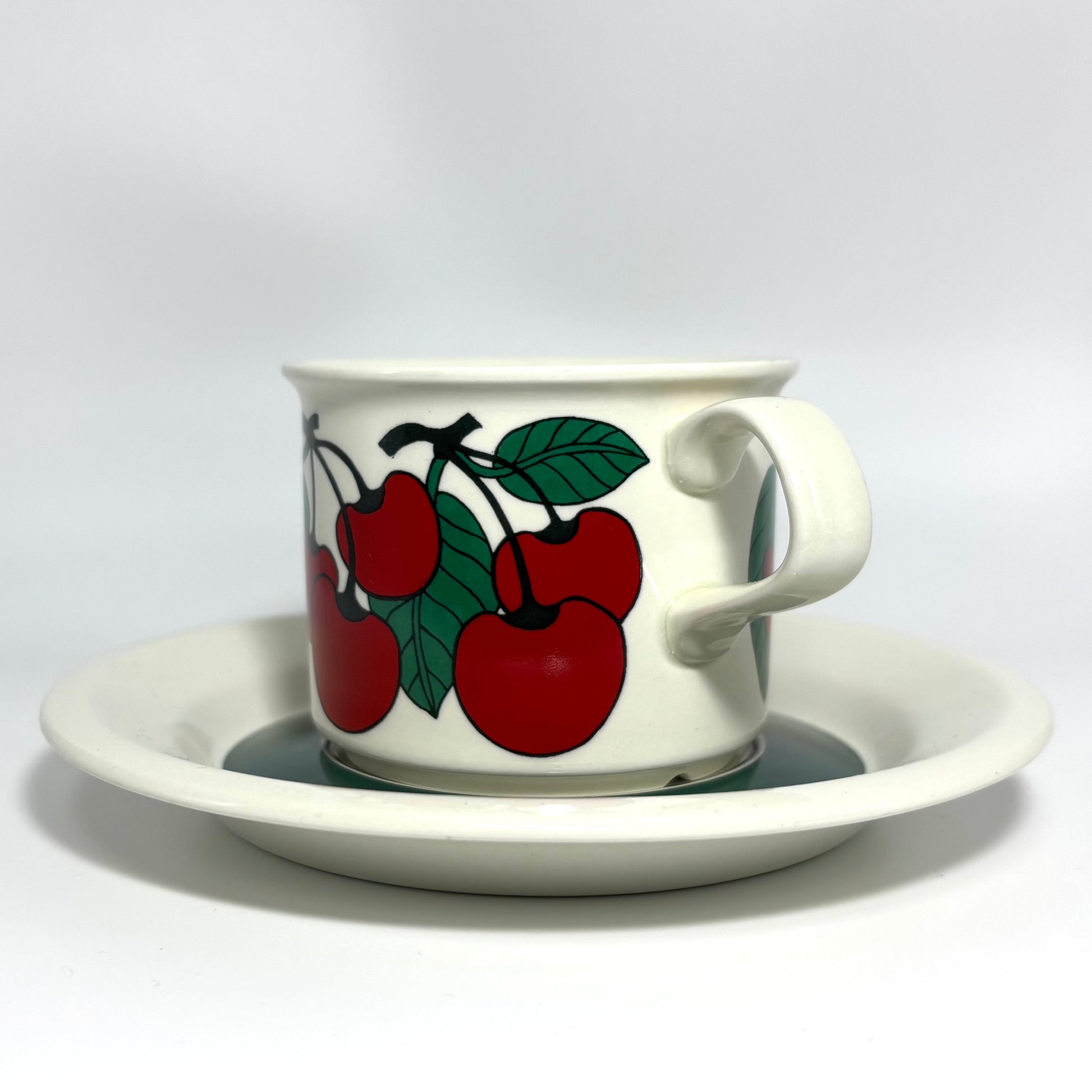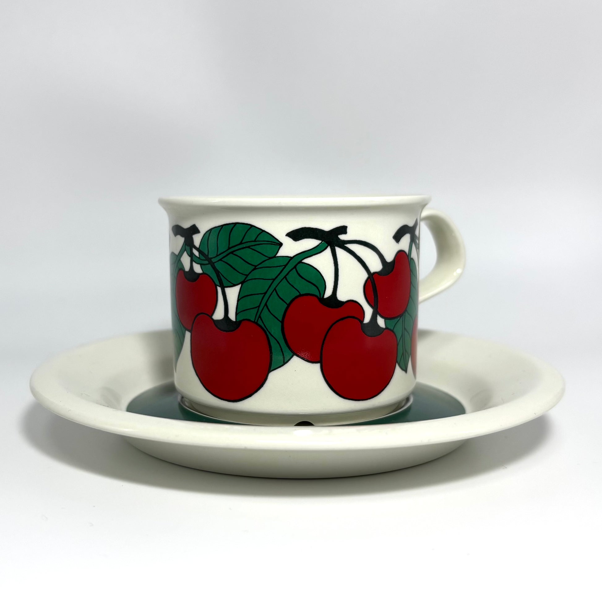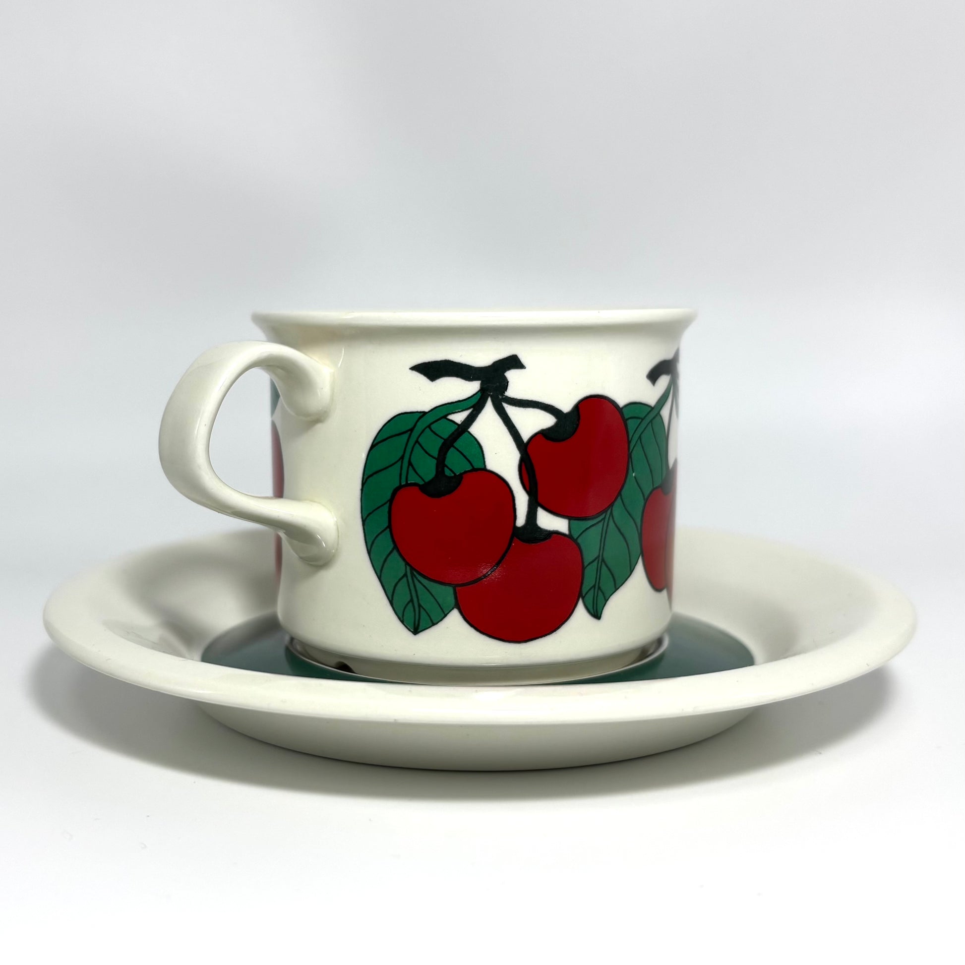 1970年代にARABIA(アラビア)で製造された、鮮やかで愛らしいデザインの 「Kirsikka(キルシッカ)」 シリーズ。フィンランド語で “さくらんぼ” を意味するその名の通り、深いレッドのチェリーと瑞々しいグリーンの葉が大胆に描かれ、北欧ヴィンテージの中でも特に人気の高いコレクションです。