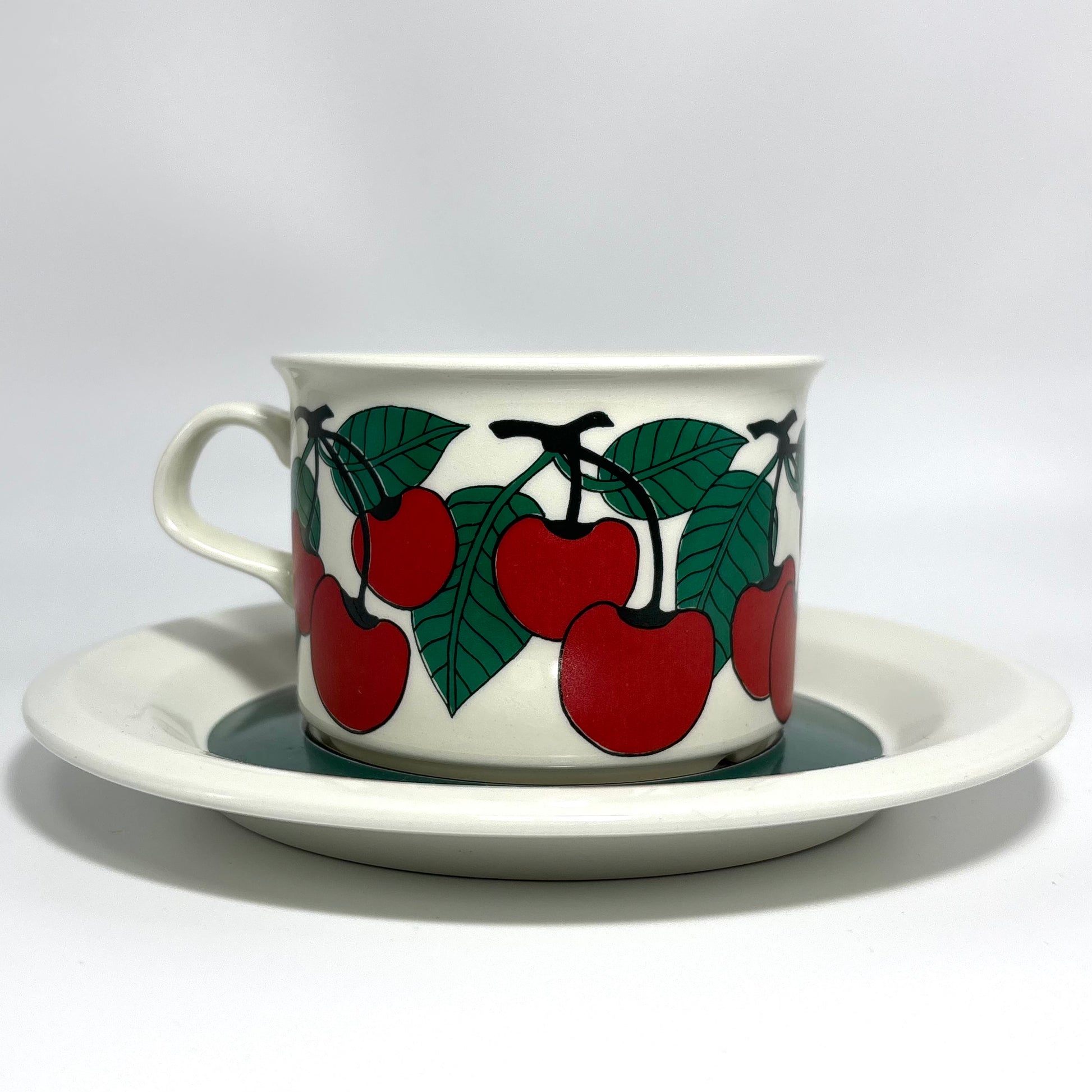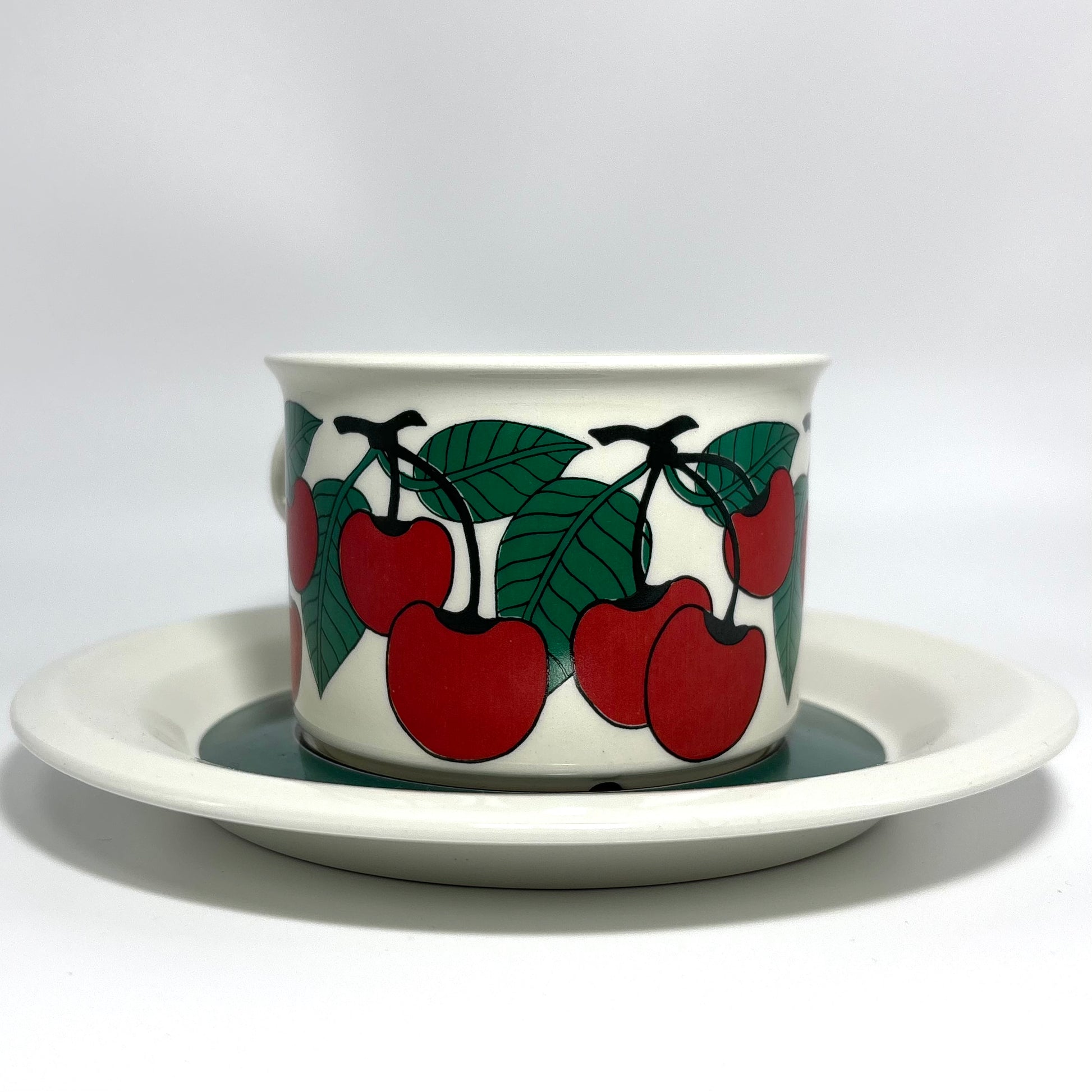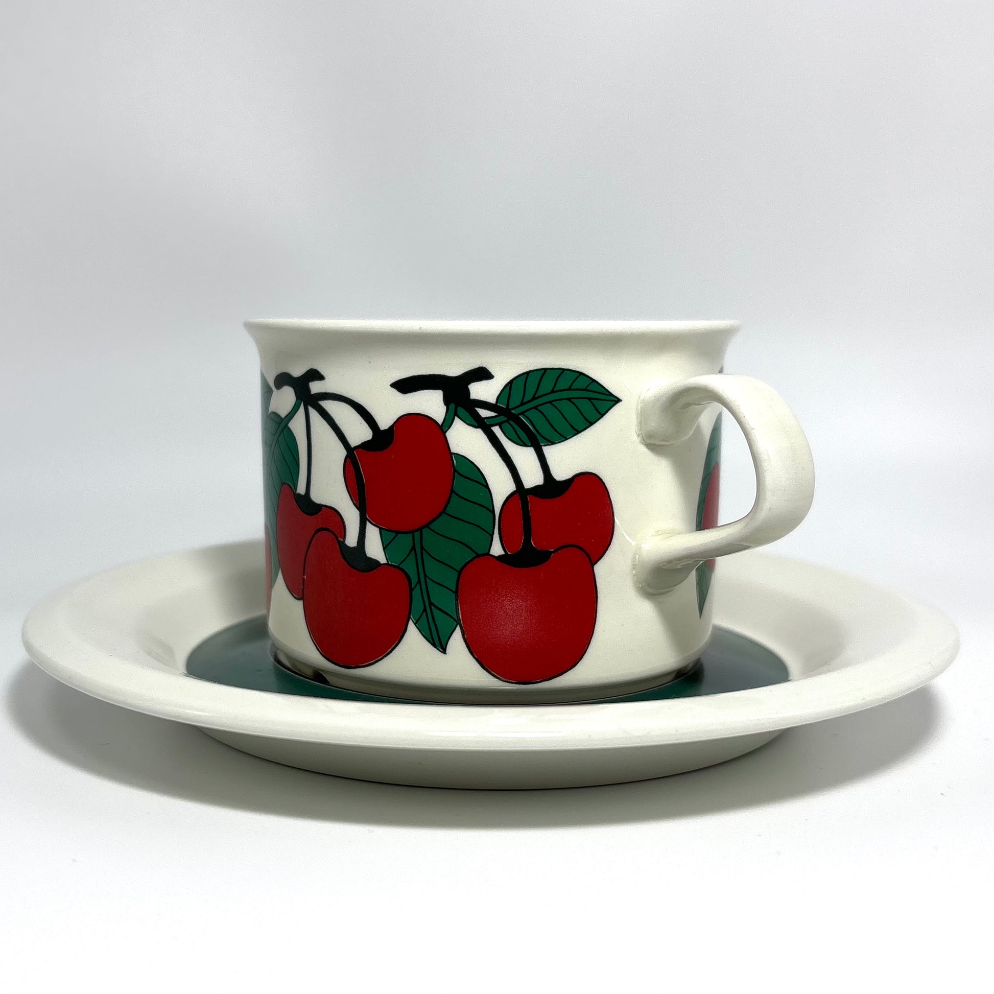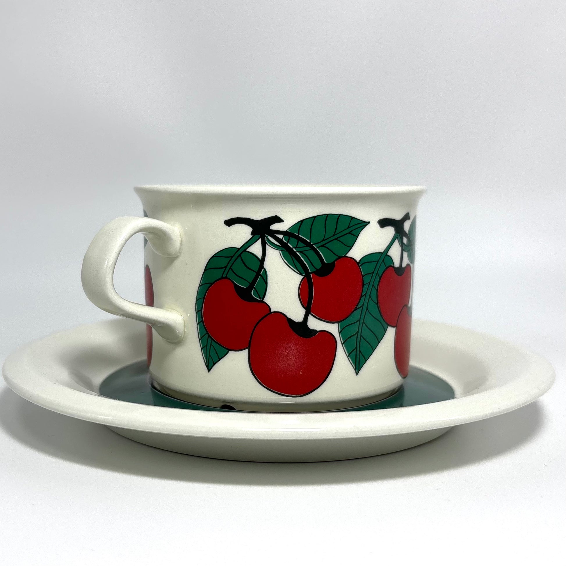 1970年代にARABIA(アラビア)で製造された、鮮やかで愛らしいデザインの 「Kirsikka(キルシッカ)」 シリーズ。フィンランド語で “さくらんぼ” を意味するその名の通り、深いレッドのチェリーと瑞々しいグリーンの葉が大胆に描かれ、北欧ヴィンテージの中でも特に人気の高いコレクションです。
