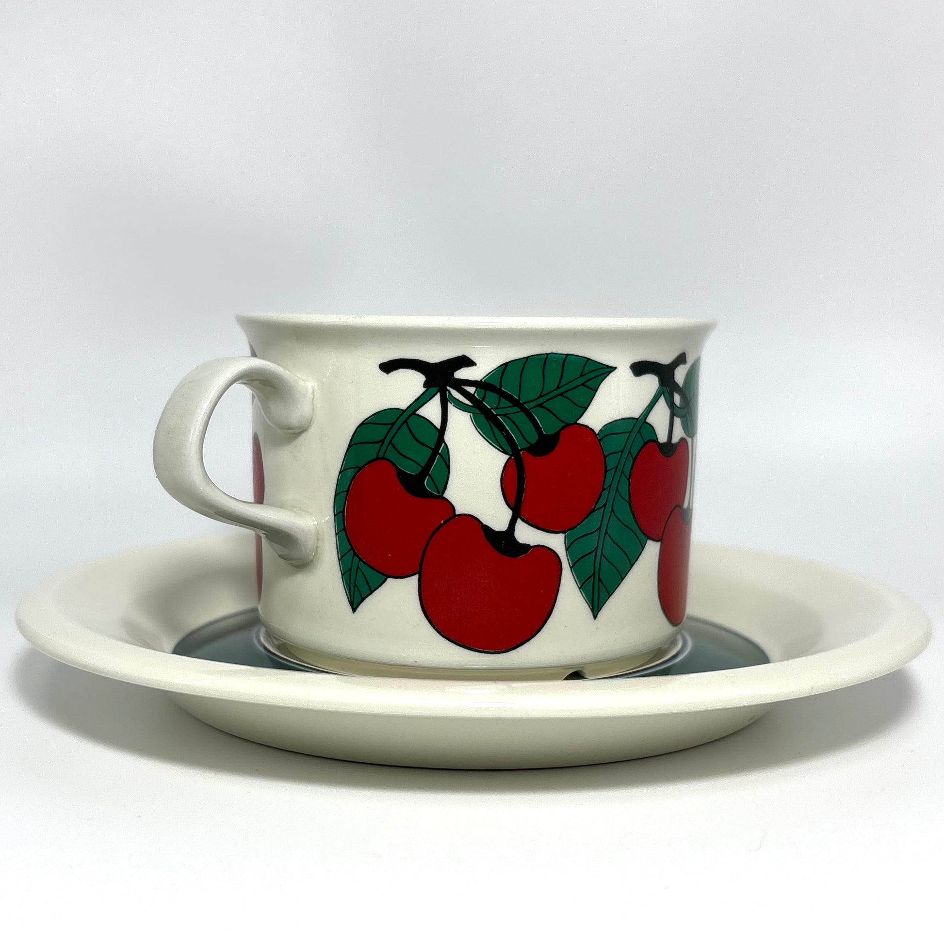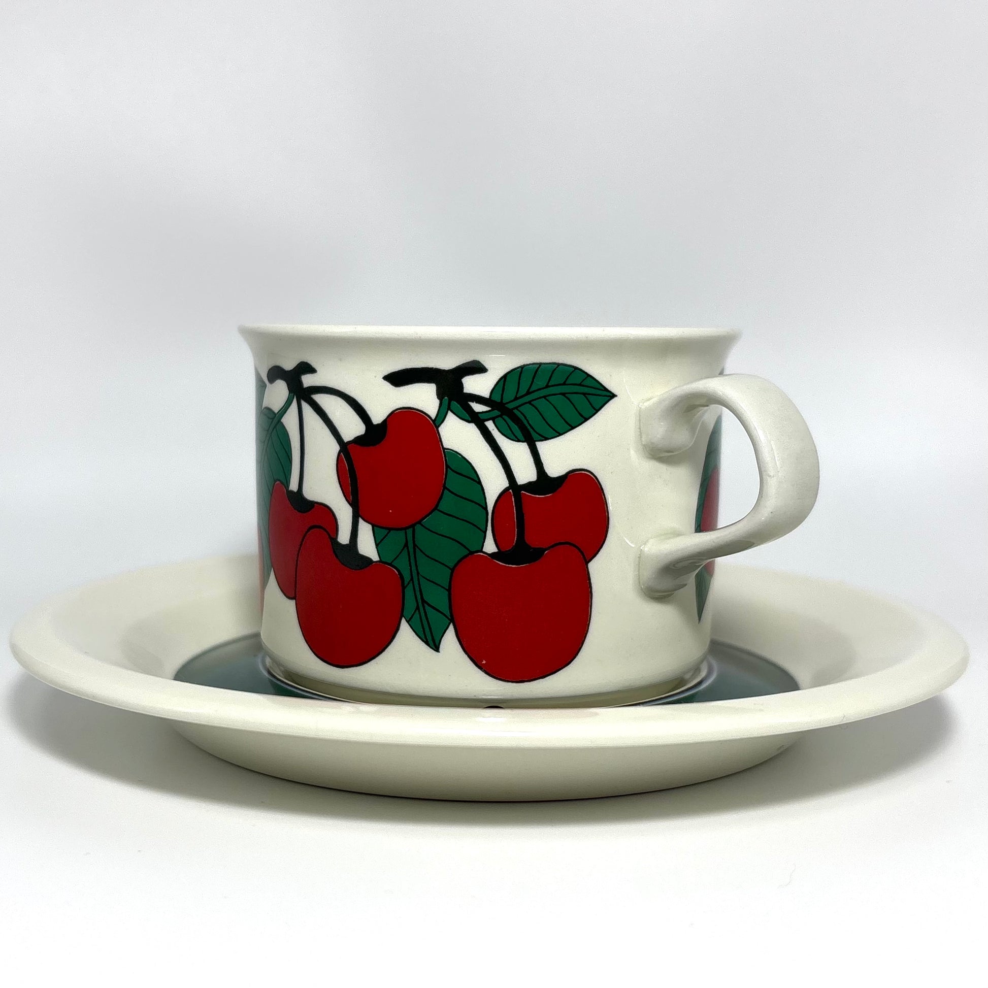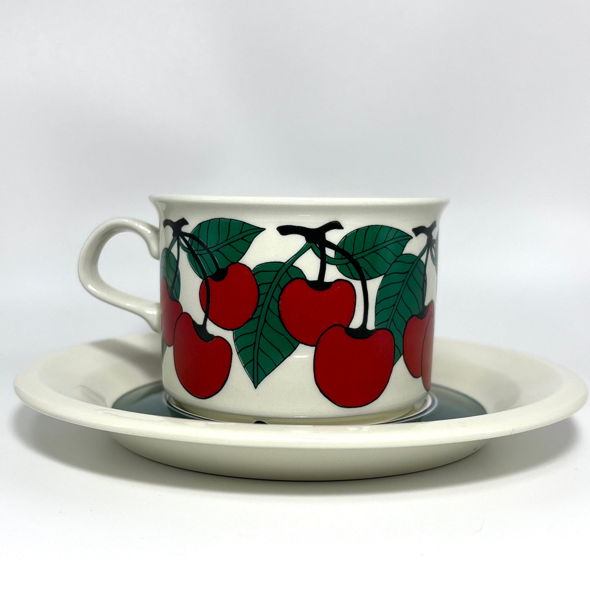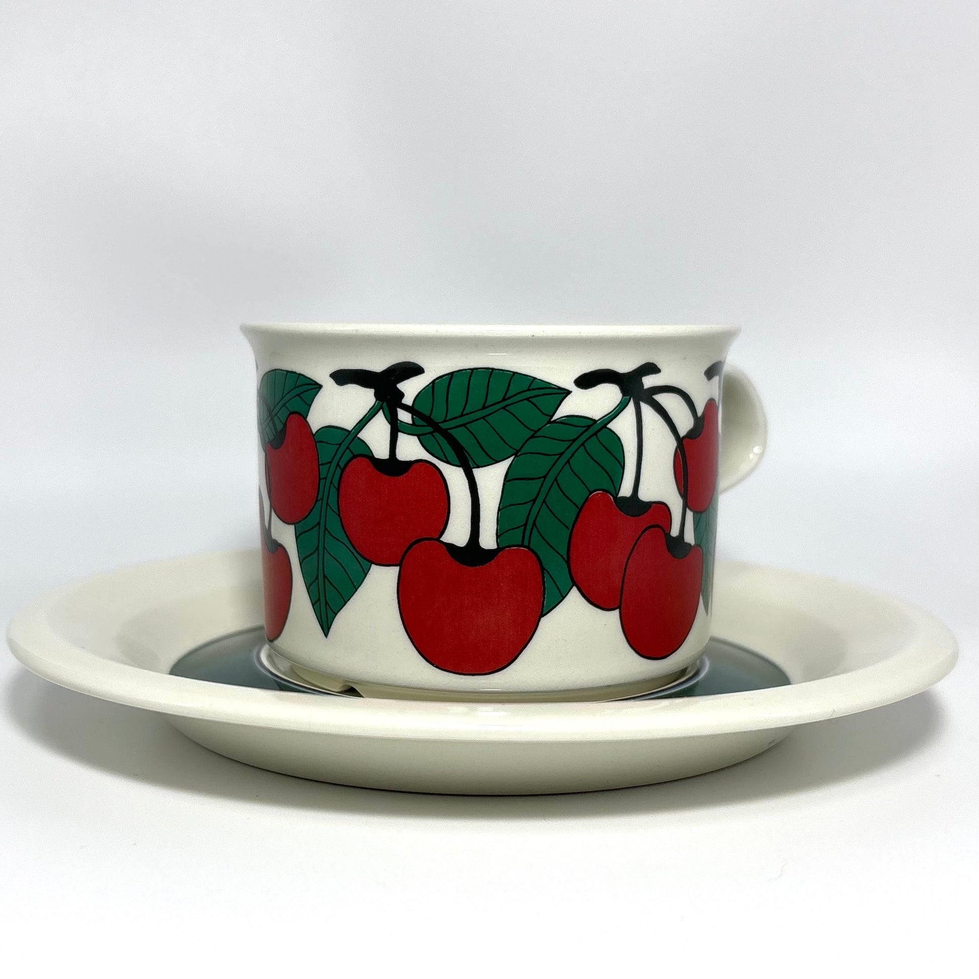 1970年代にARABIA(アラビア)で製造された、鮮やかで愛らしいデザインの 「Kirsikka(キルシッカ)」 シリーズ。フィンランド語で “さくらんぼ” を意味するその名の通り、深いレッドのチェリーと瑞々しいグリーンの葉が大胆に描かれ、北欧ヴィンテージの中でも特に人気の高いコレクションです。