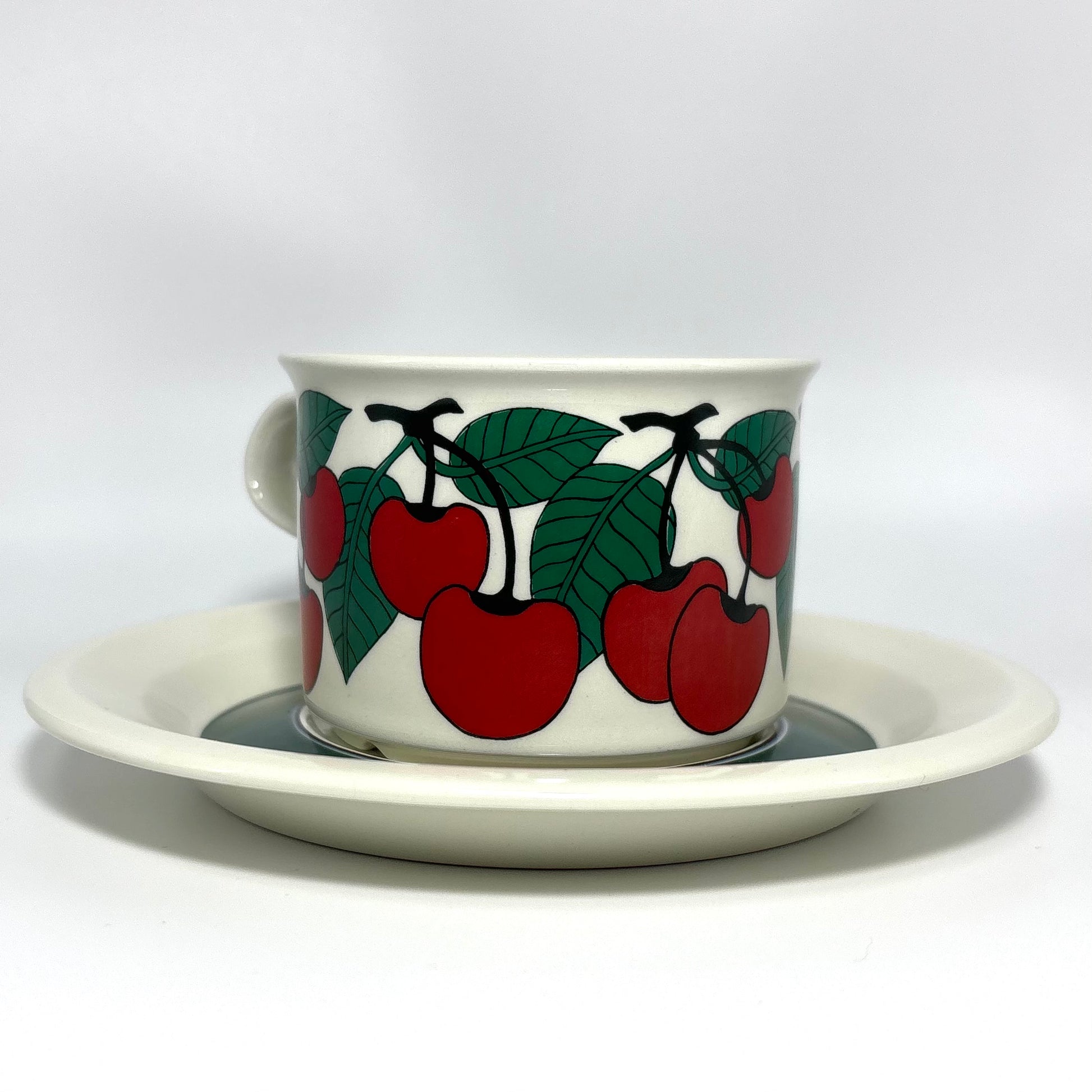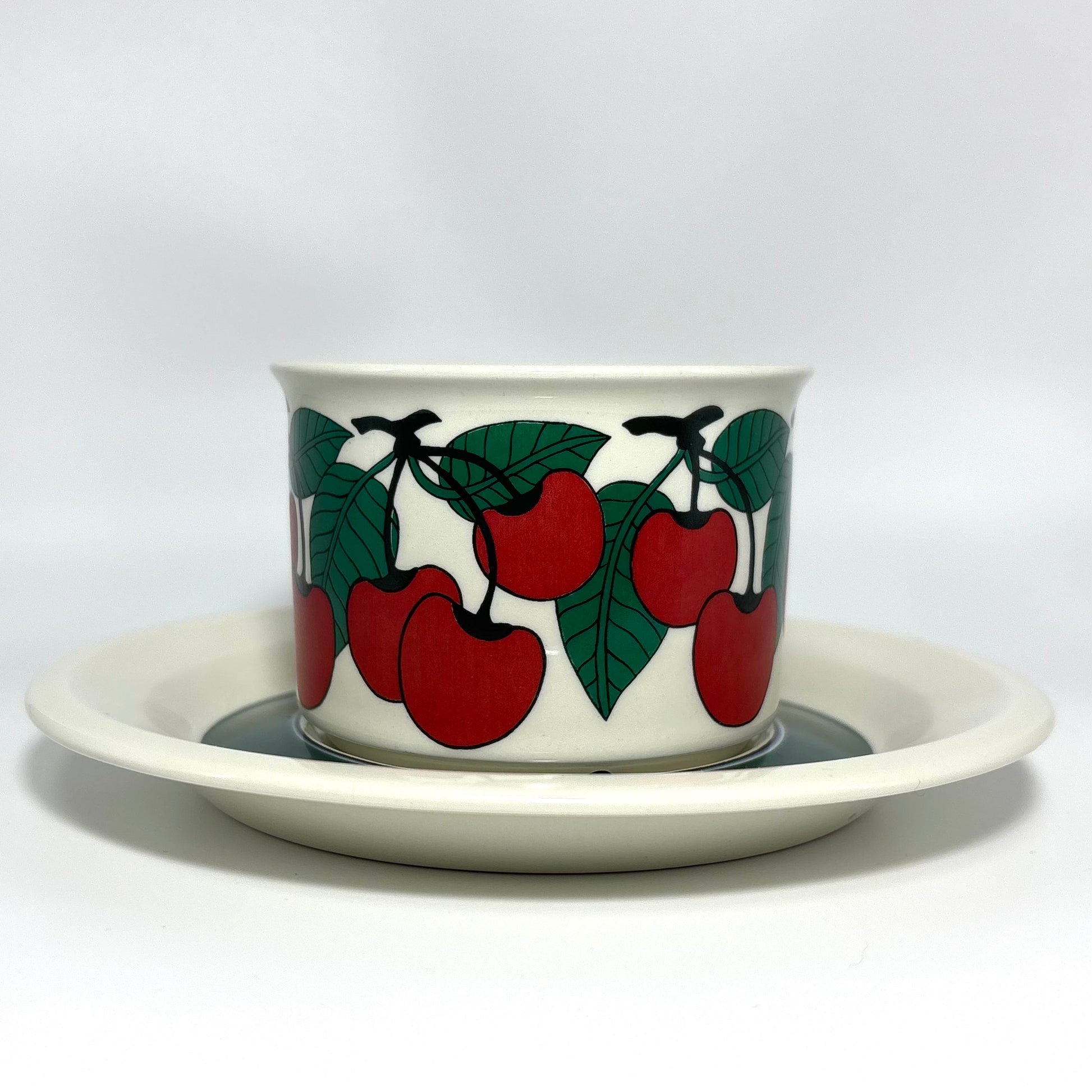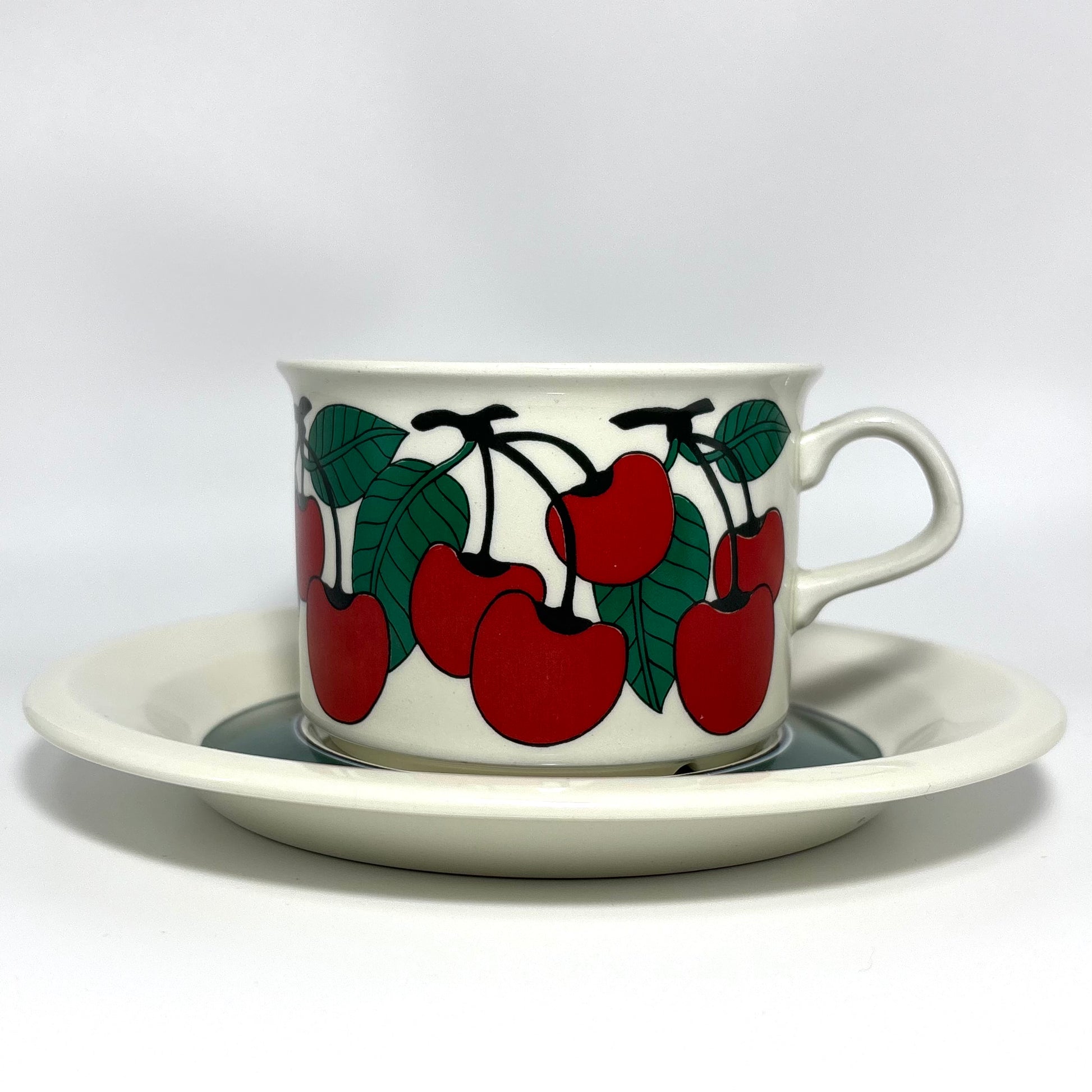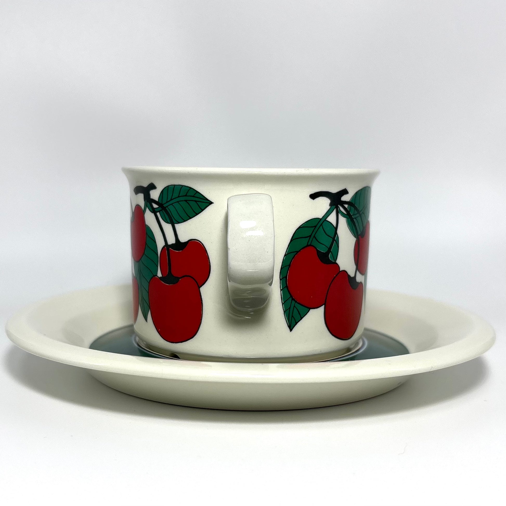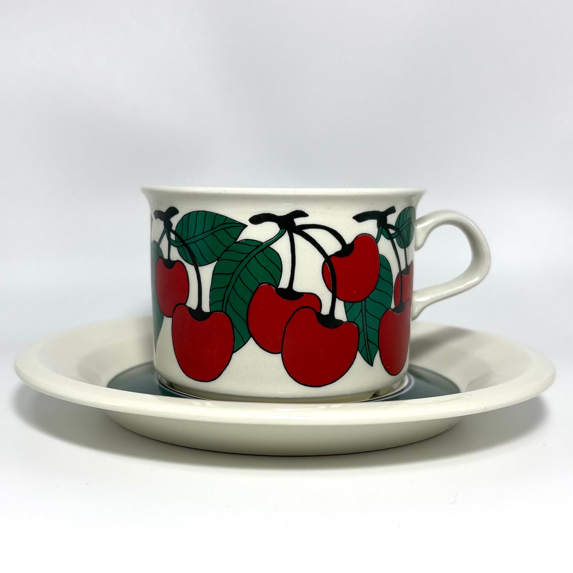 1970年代にARABIA(アラビア)で製造された、鮮やかで愛らしいデザインの 「Kirsikka(キルシッカ)」 シリーズ。フィンランド語で “さくらんぼ” を意味するその名の通り、深いレッドのチェリーと瑞々しいグリーンの葉が大胆に描かれ、北欧ヴィンテージの中でも特に人気の高いコレクションです。