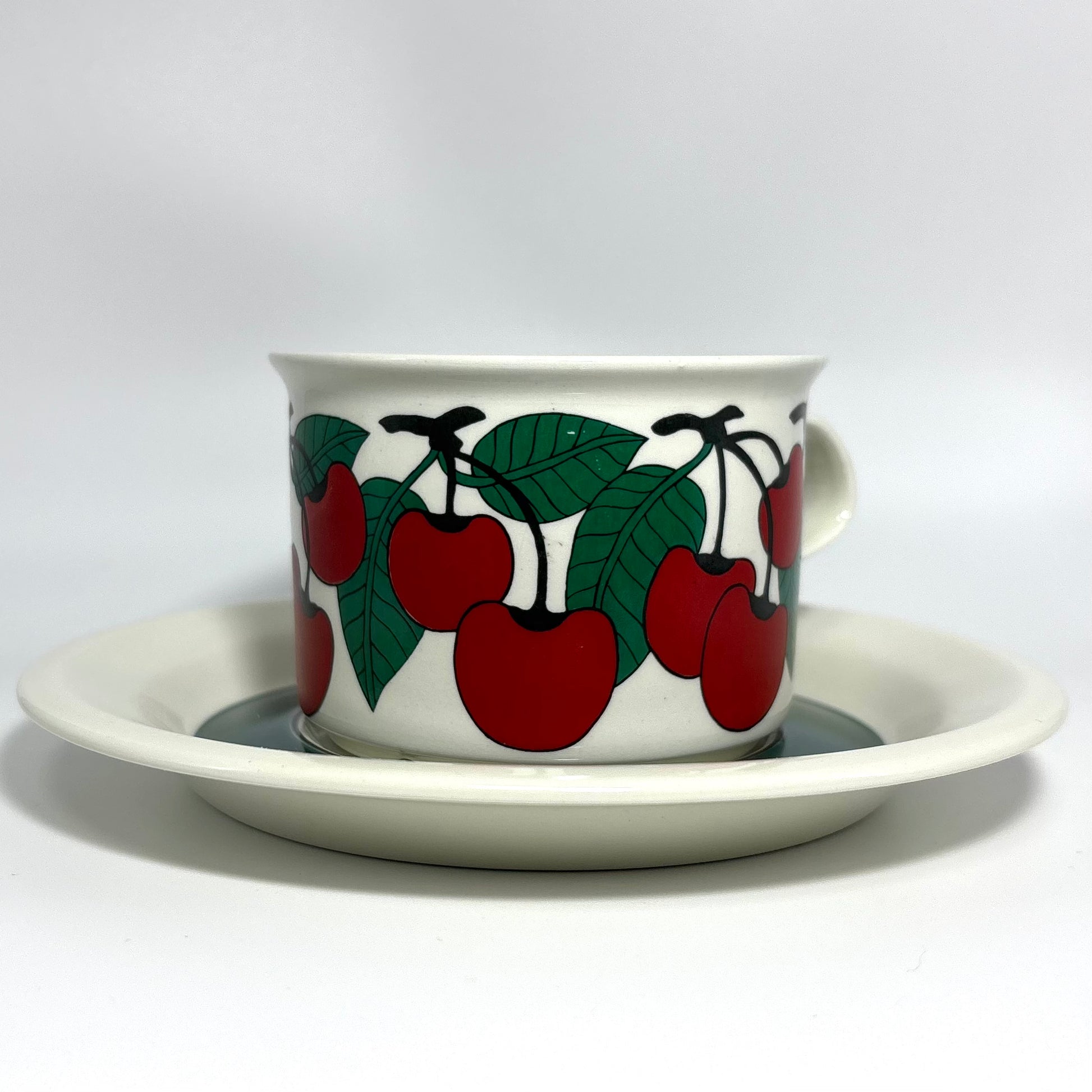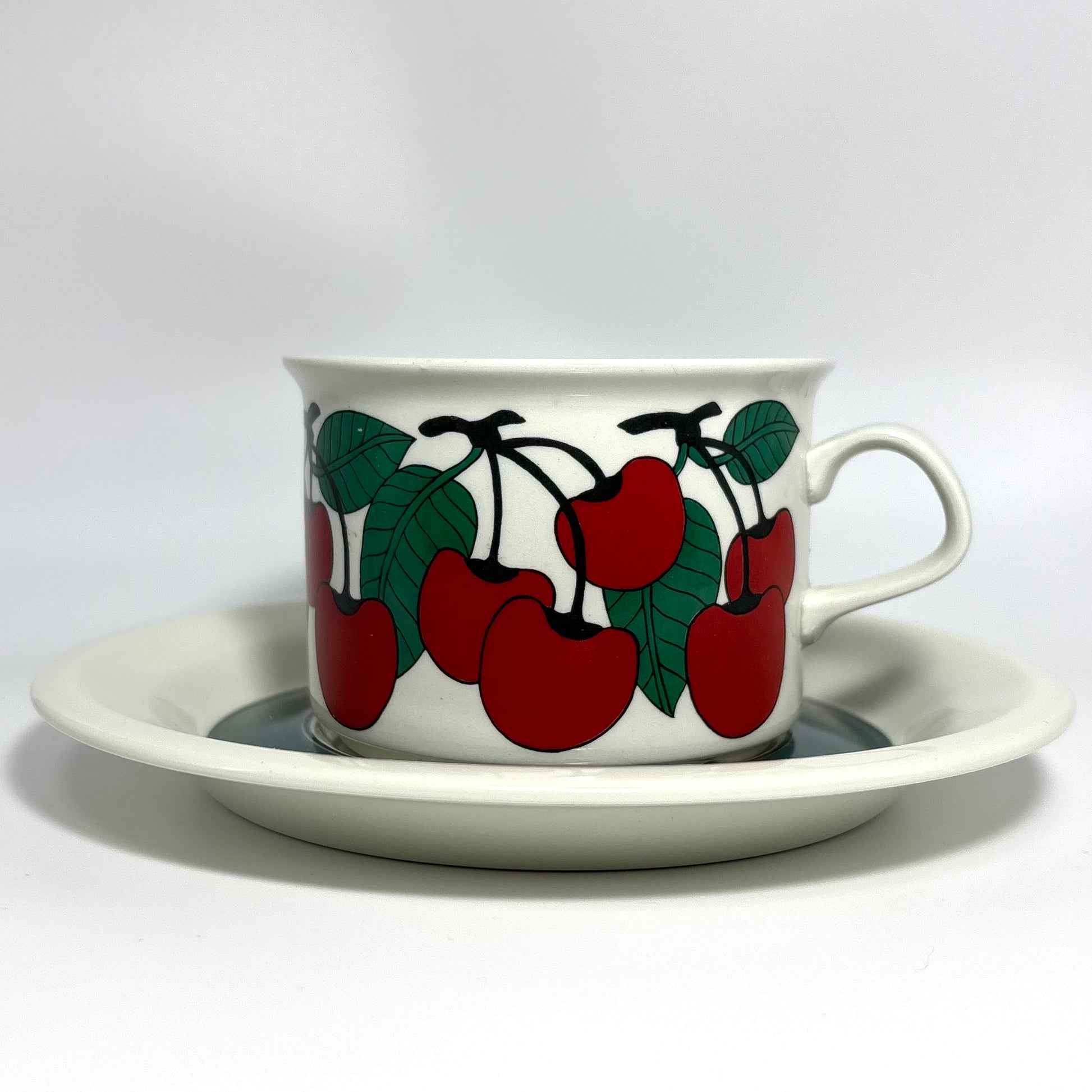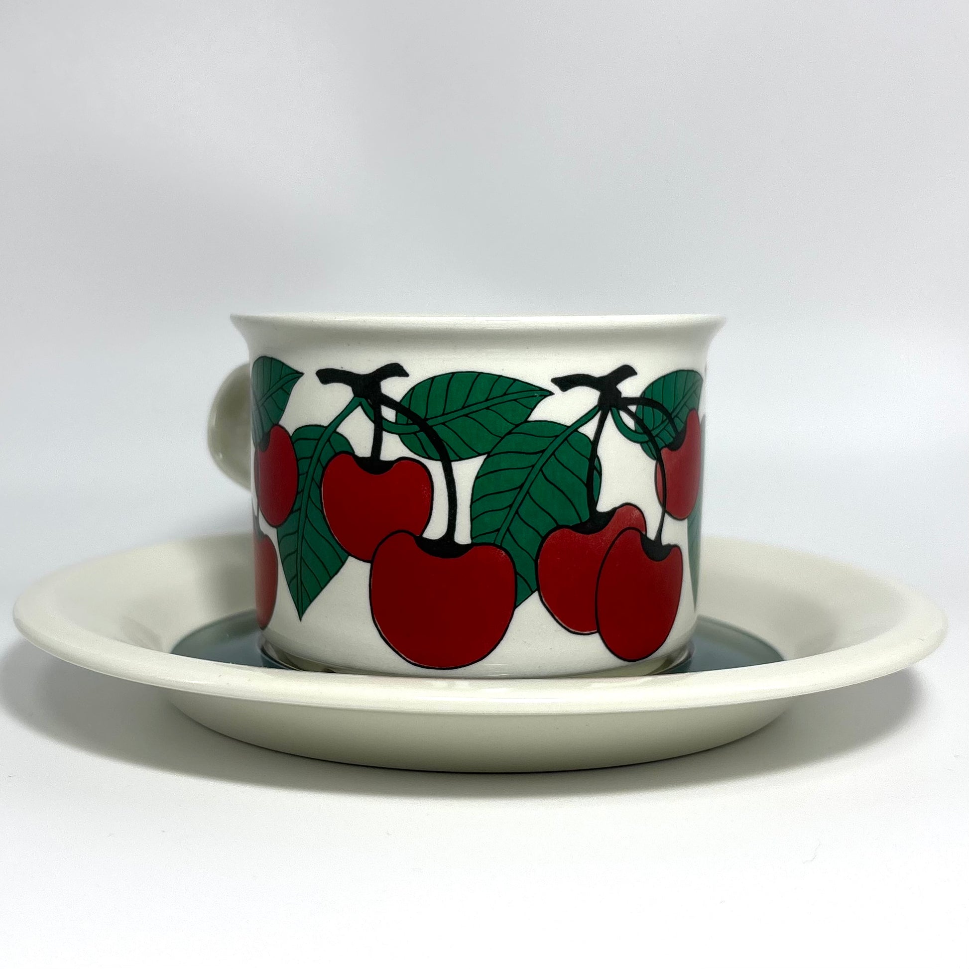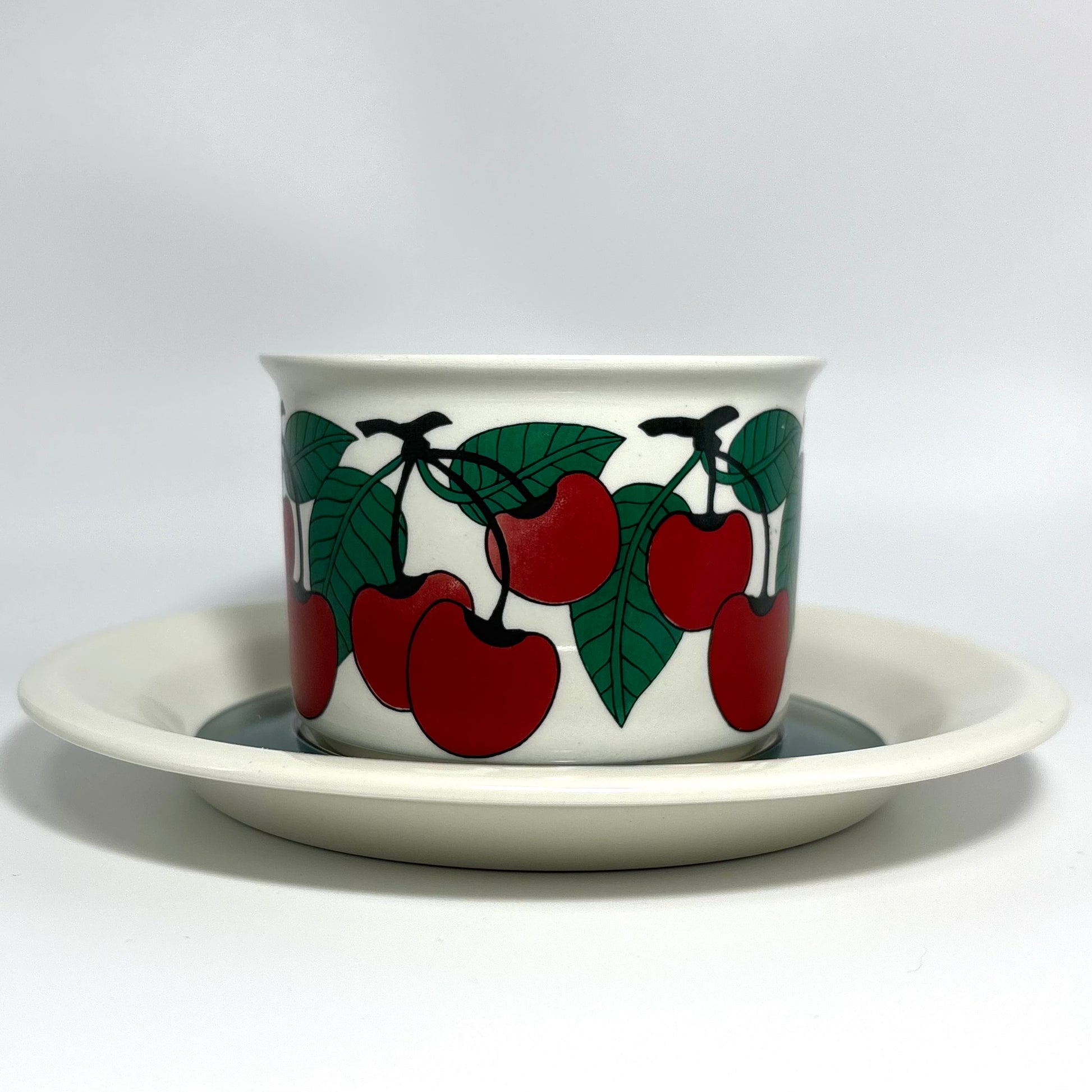1970年代にARABIA(アラビア)で製造された、鮮やかで愛らしいデザインの 「Kirsikka(キルシッカ)」 シリーズ。フィンランド語で “さくらんぼ” を意味するその名の通り、深いレッドのチェリーと瑞々しいグリーンの葉が大胆に描かれ、北欧ヴィンテージの中でも特に人気の高いコレクションです。
