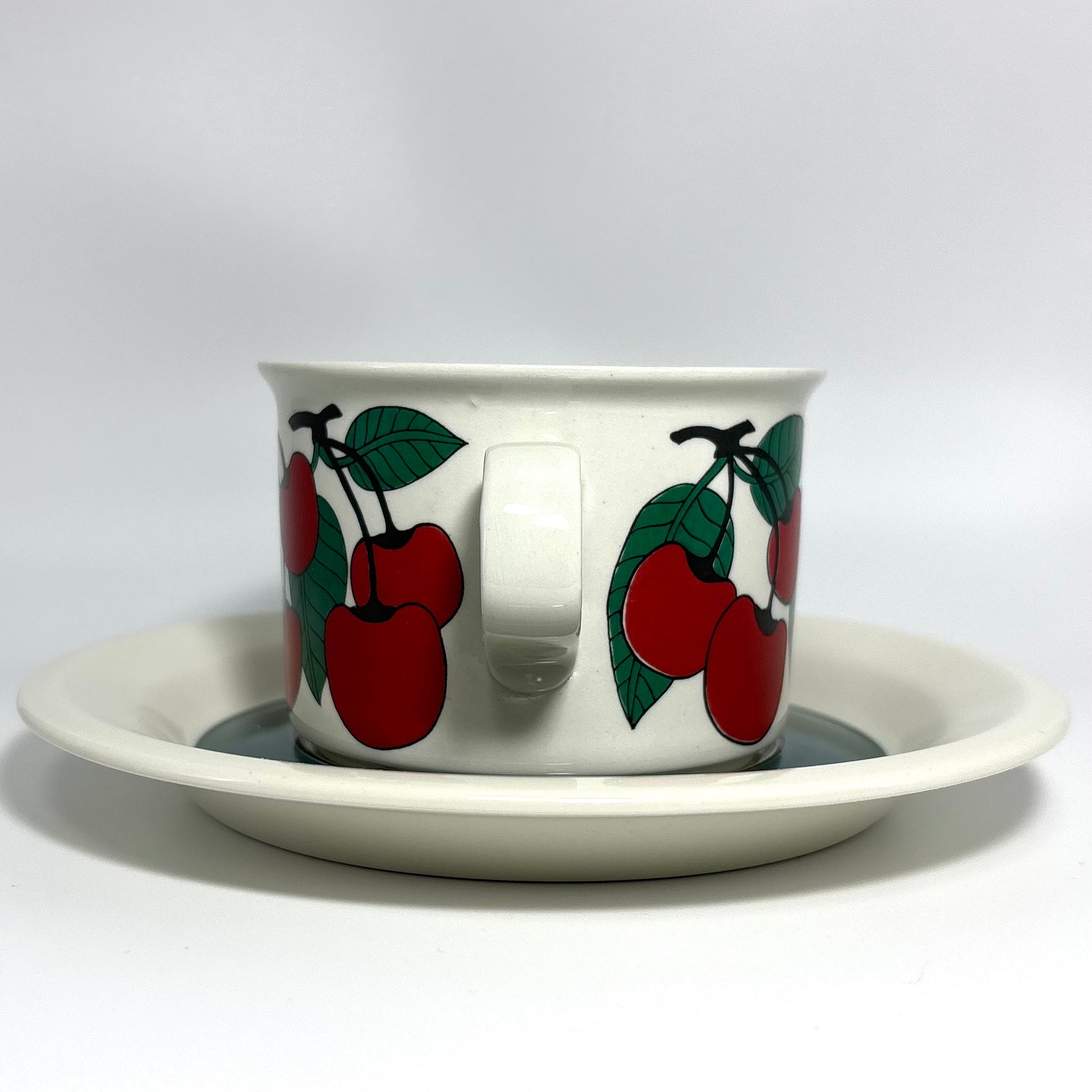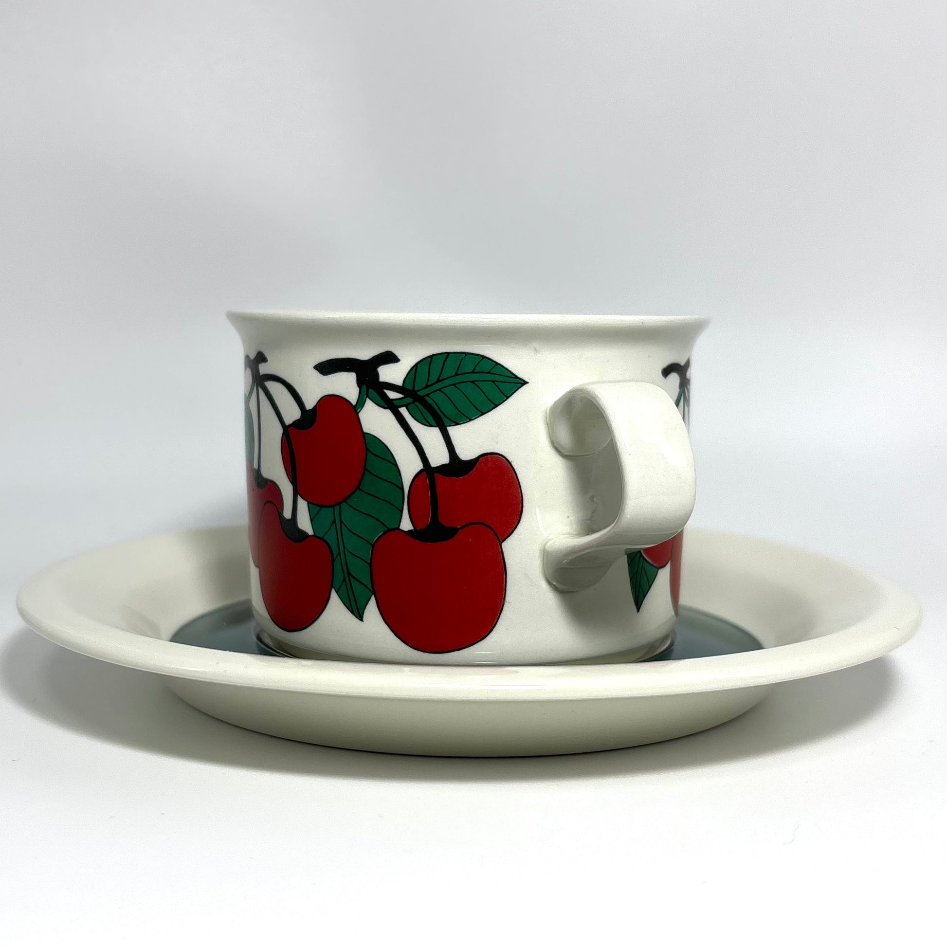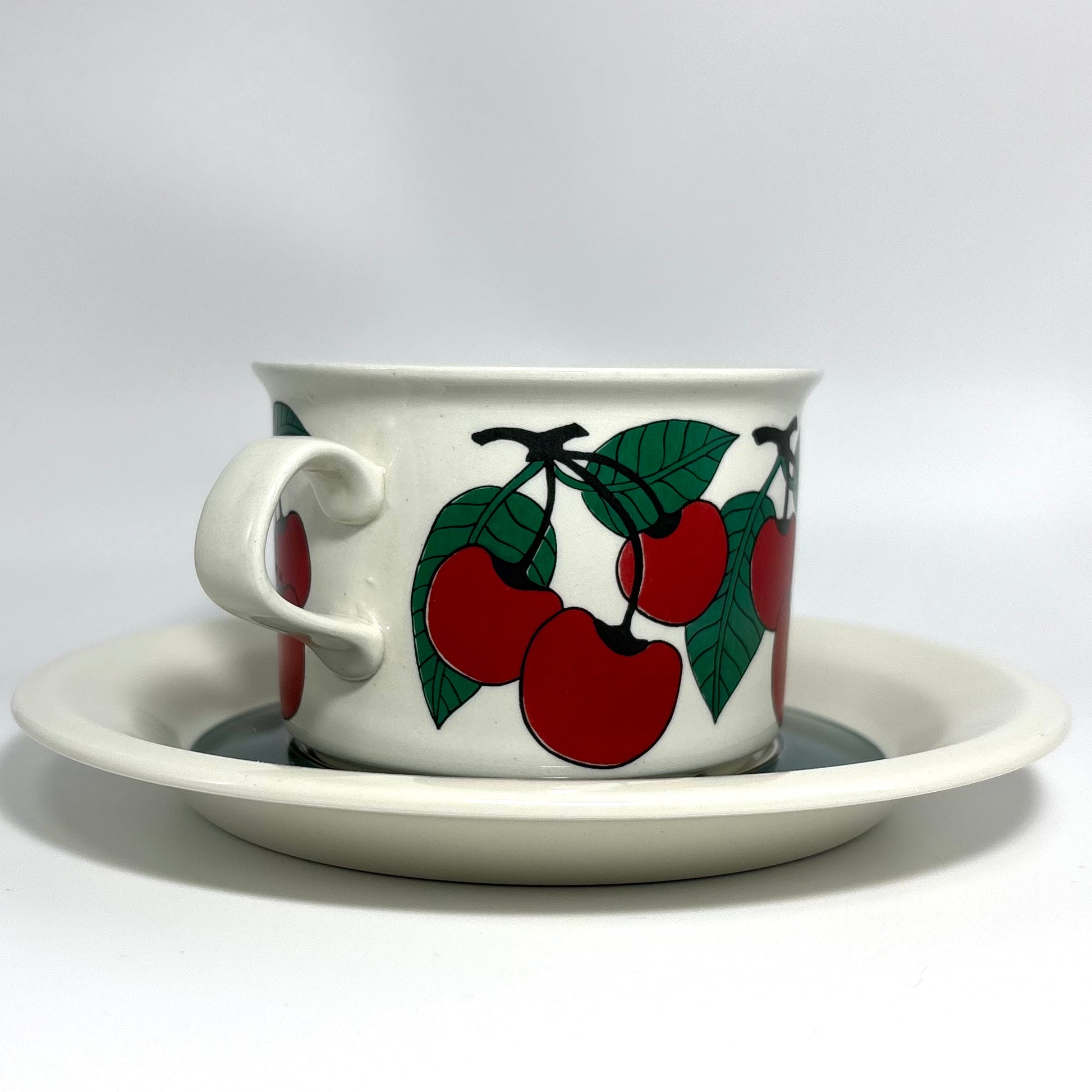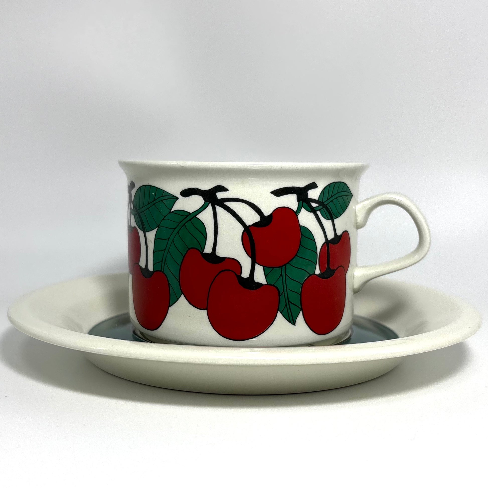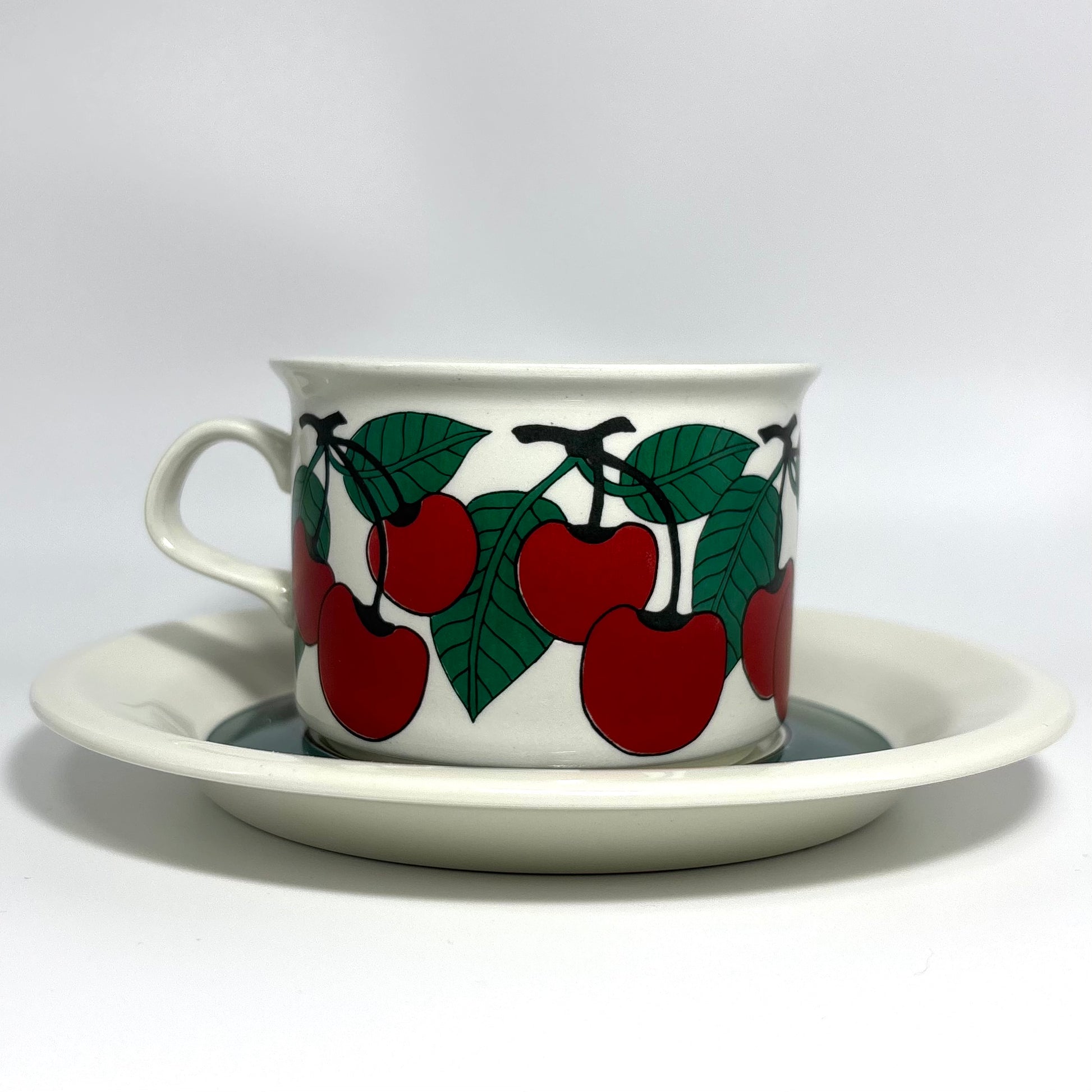 1970年代にARABIA(アラビア)で製造された、鮮やかで愛らしいデザインの 「Kirsikka(キルシッカ)」 シリーズ。フィンランド語で “さくらんぼ” を意味するその名の通り、深いレッドのチェリーと瑞々しいグリーンの葉が大胆に描かれ、北欧ヴィンテージの中でも特に人気の高いコレクションです。