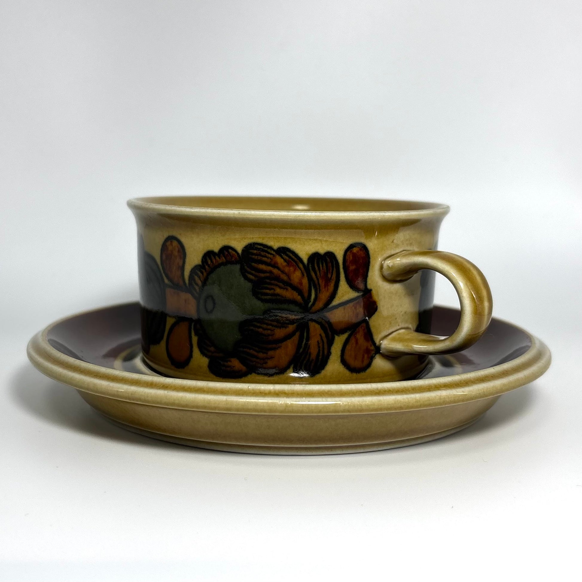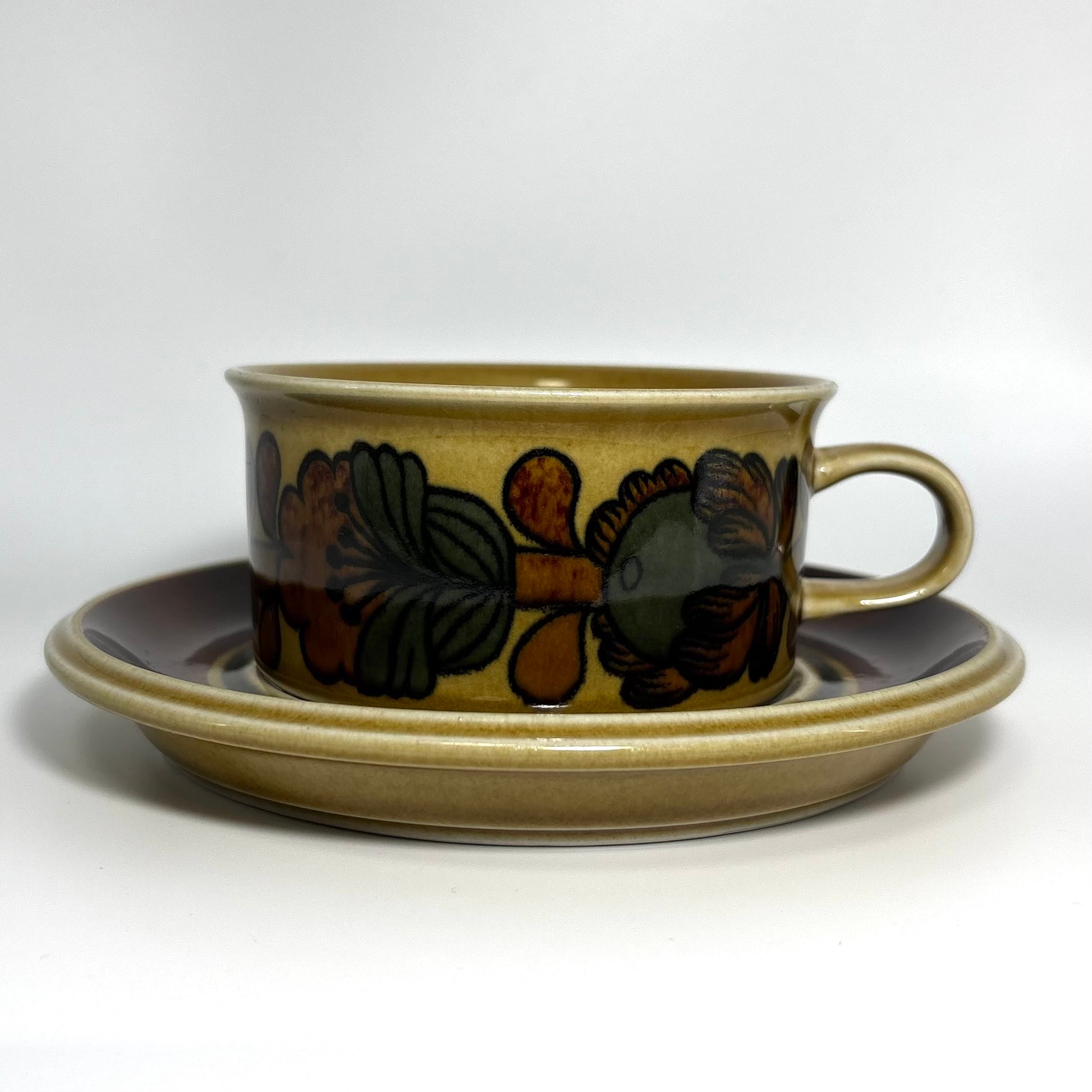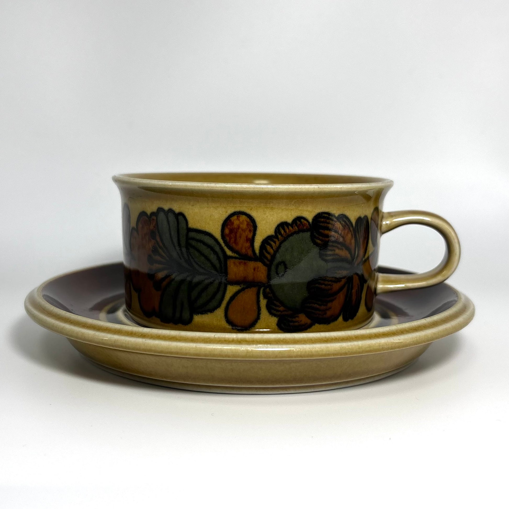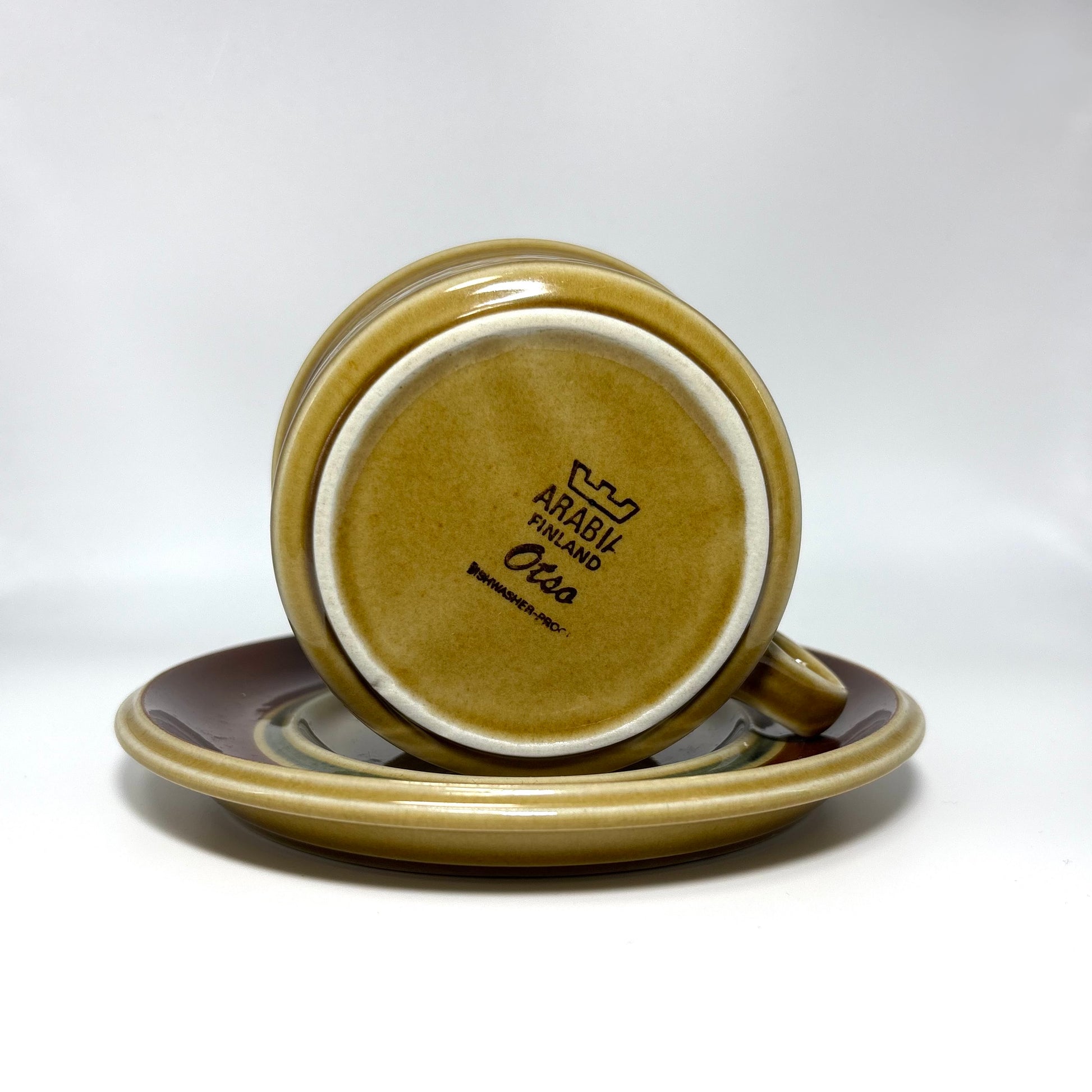 本商品は、フィンランドの名窯ARABIAで1975年から1978年にかけて製造された“Otso”シリーズのティーカップ&ソーサーです。フォルムはARABIAを代表するデザイナー Ulla Procopé(ウッラ・プロコペ)、デコレーションは Gunvor Olin-Grönqvist(グンヴァル・オリン・グロンクヴィスト) が手がけています。端正で使いやすいプロコペのフォルムに、落ち着いたブラウンを基調とした温かな装飾が重なり、北欧ヴィンテージらしい素朴さと上品さを兼ね備えた一客に仕上がっています。