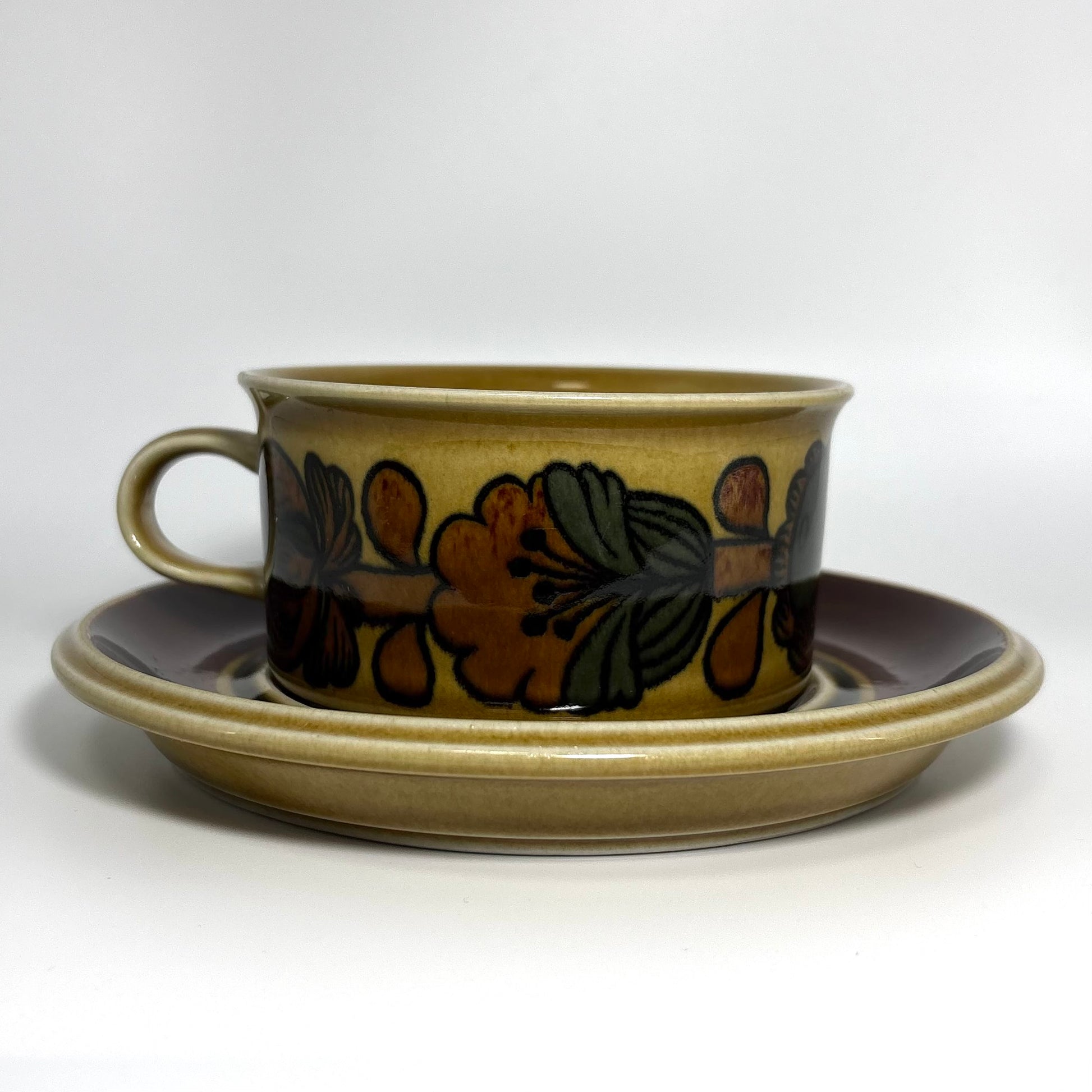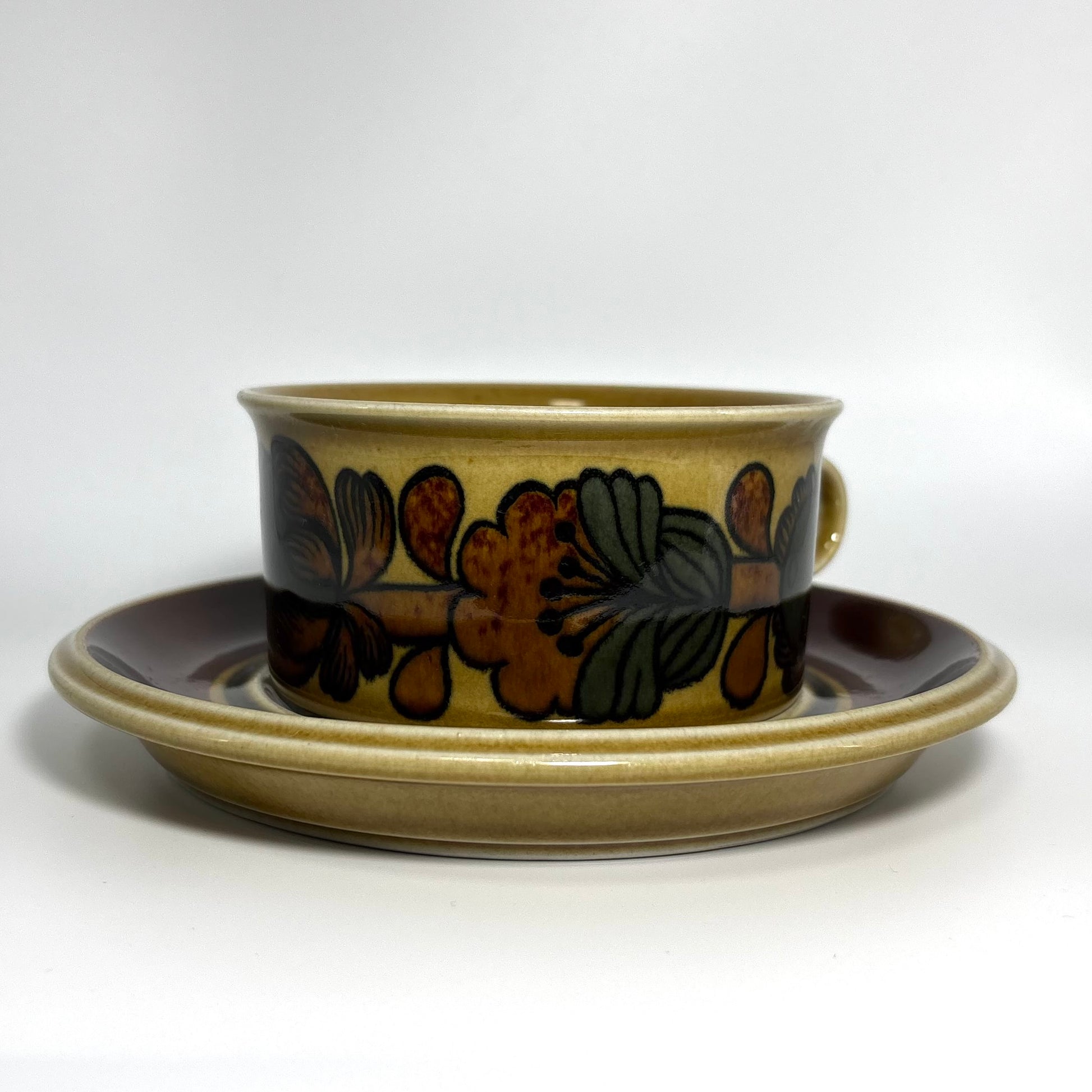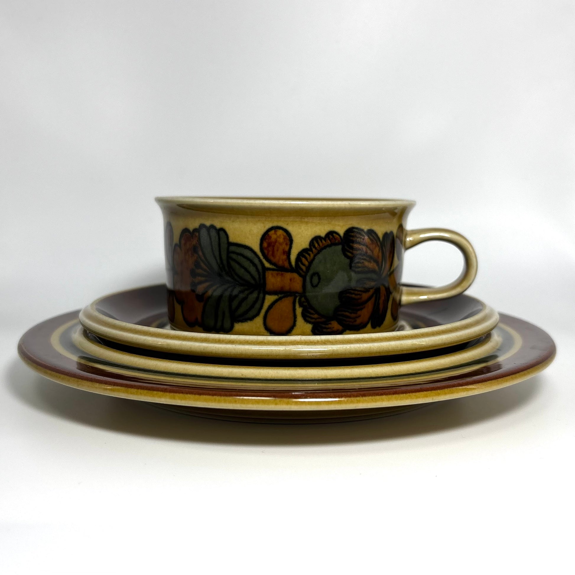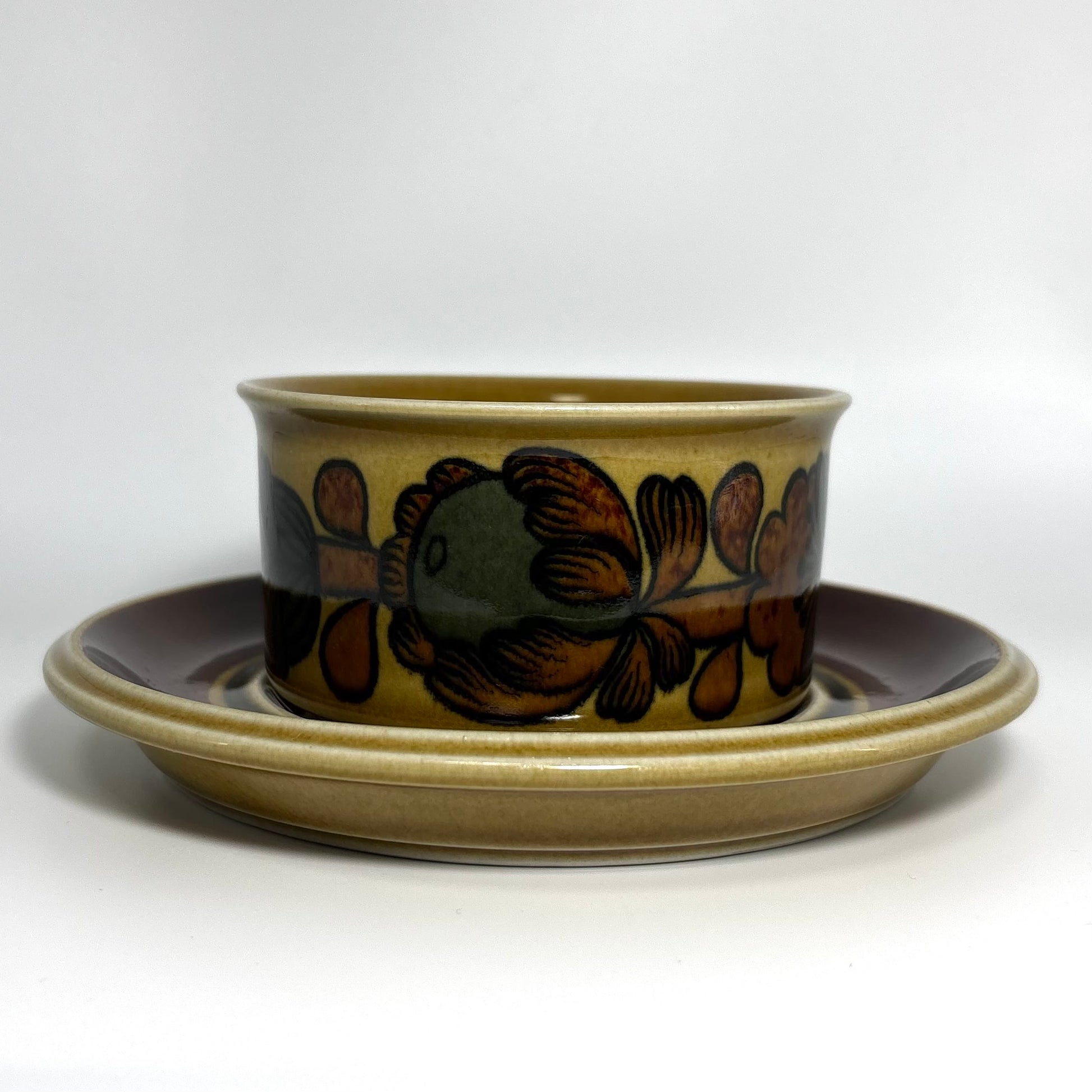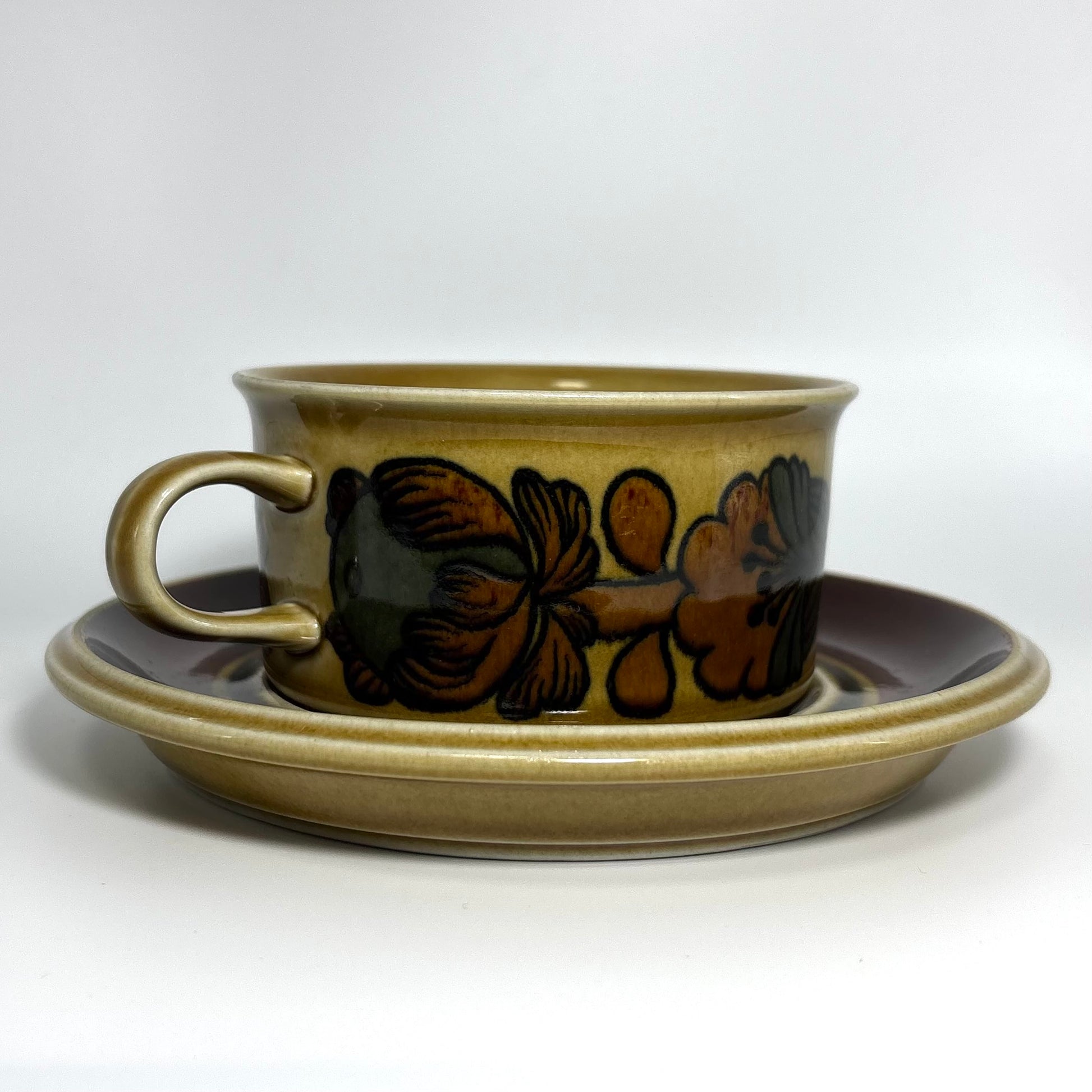 本商品は、フィンランドの名窯ARABIAで1975年から1978年にかけて製造された“Otso”シリーズのティーカップ&ソーサーです。フォルムはARABIAを代表するデザイナー Ulla Procopé(ウッラ・プロコペ)、デコレーションは Gunvor Olin-Grönqvist(グンヴァル・オリン・グロンクヴィスト) が手がけています。端正で使いやすいプロコペのフォルムに、落ち着いたブラウンを基調とした温かな装飾が重なり、北欧ヴィンテージらしい素朴さと上品さを兼ね備えた一客に仕上がっています。