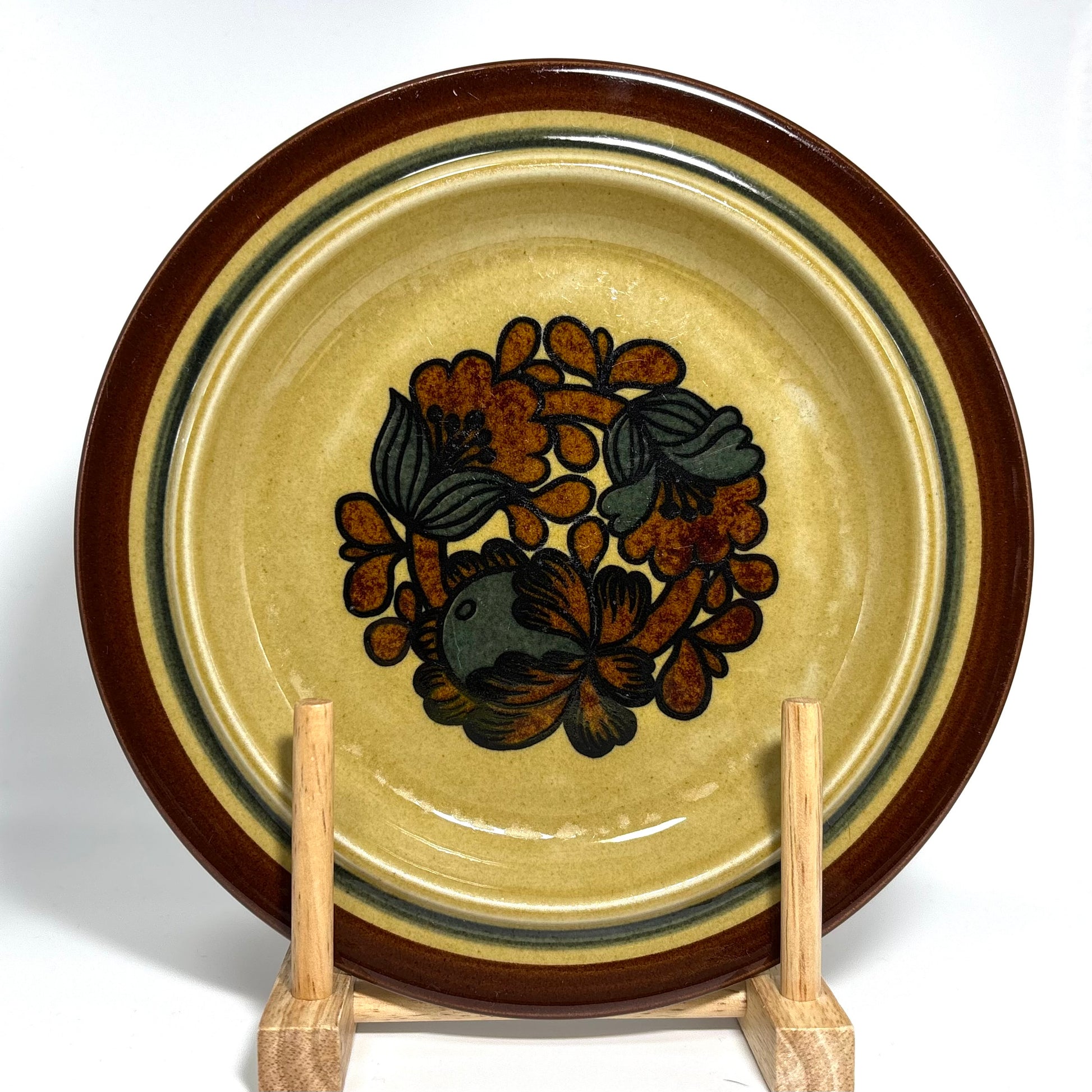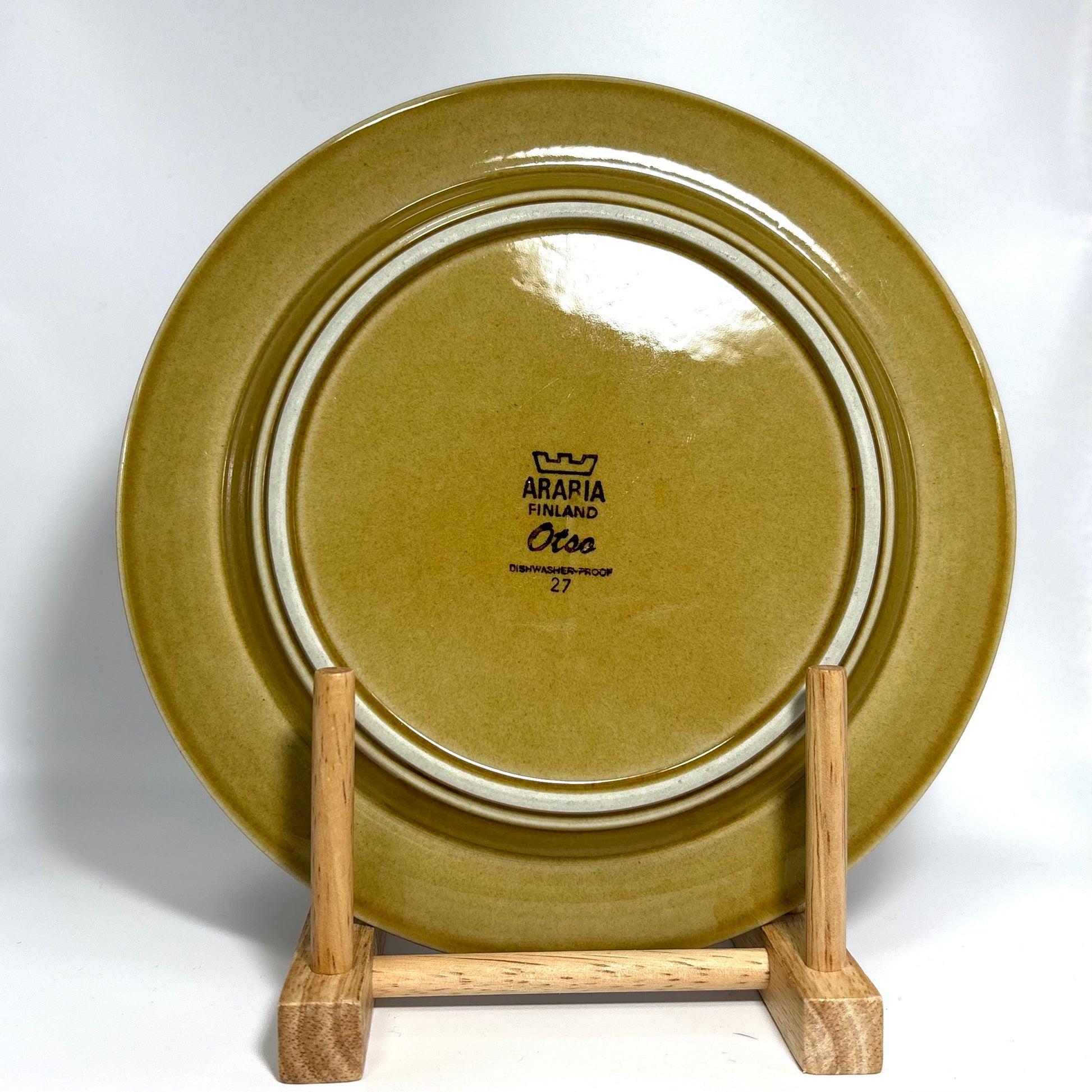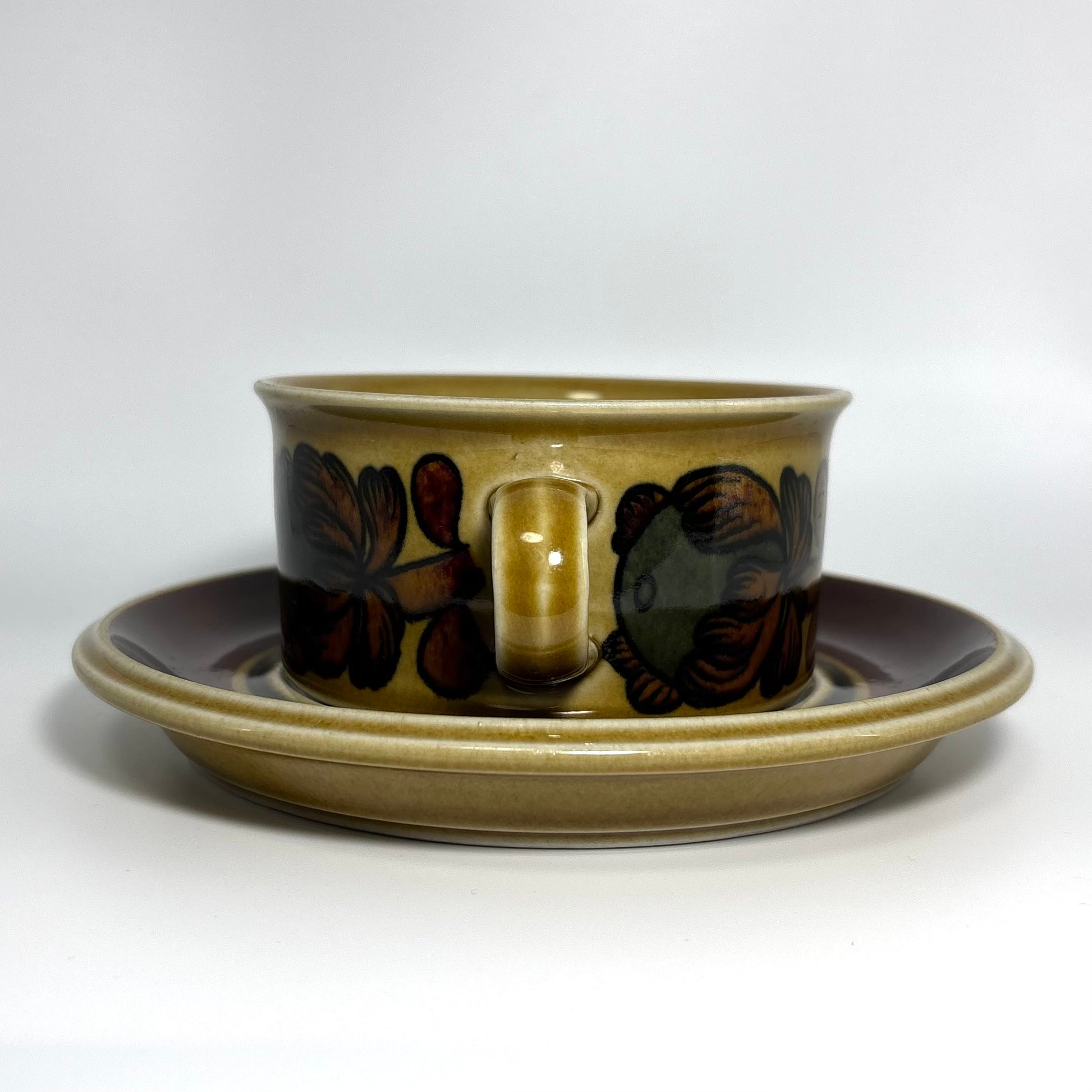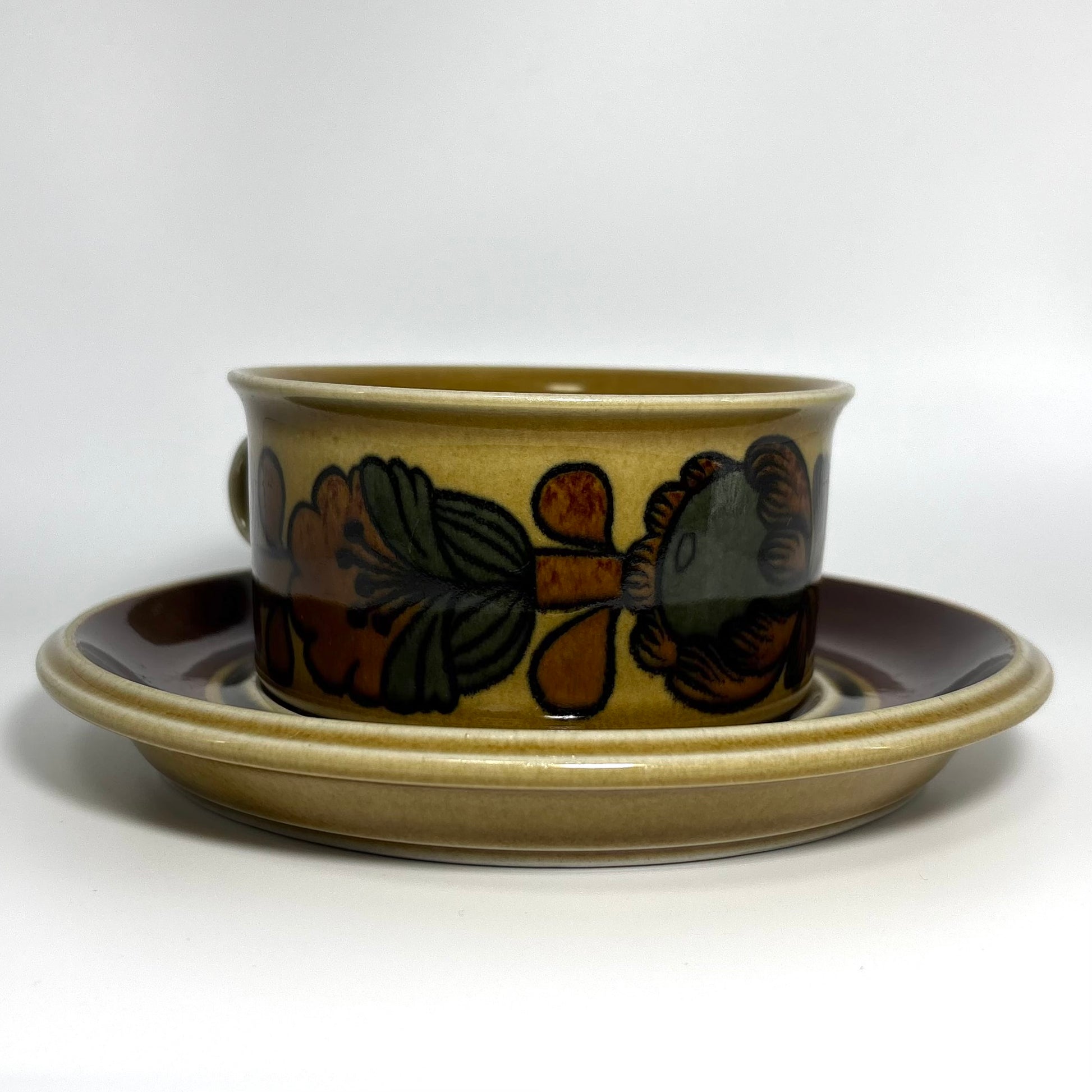 本商品は、フィンランドの名窯ARABIAで1975年から1978年にかけて製造された“Otso”シリーズのティーカップ&ソーサーです。フォルムはARABIAを代表するデザイナー Ulla Procopé(ウッラ・プロコペ)、デコレーションは Gunvor Olin-Grönqvist(グンヴァル・オリン・グロンクヴィスト) が手がけています。端正で使いやすいプロコペのフォルムに、落ち着いたブラウンを基調とした温かな装飾が重なり、北欧ヴィンテージらしい素朴さと上品さを兼ね備えた一客に仕上がっています。
