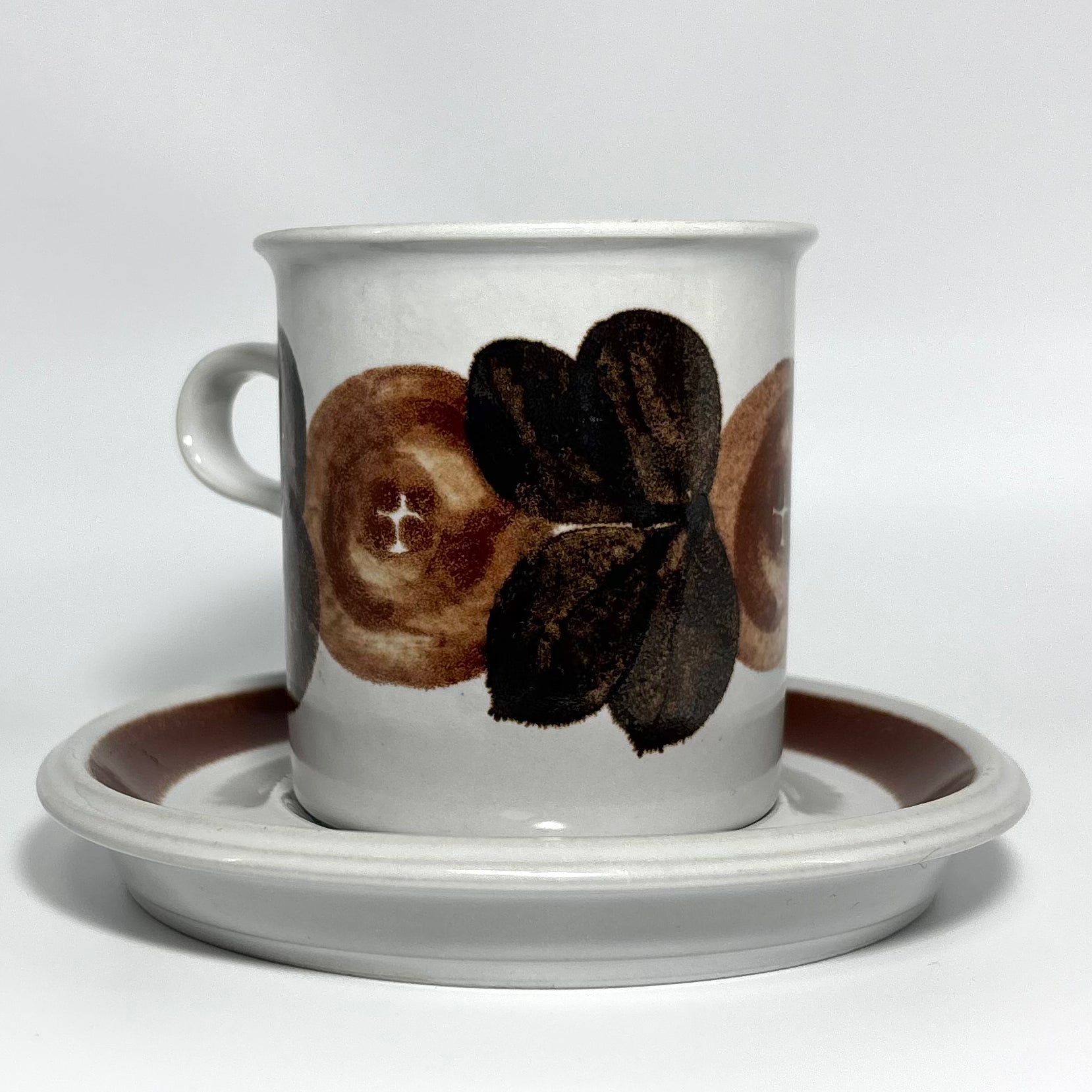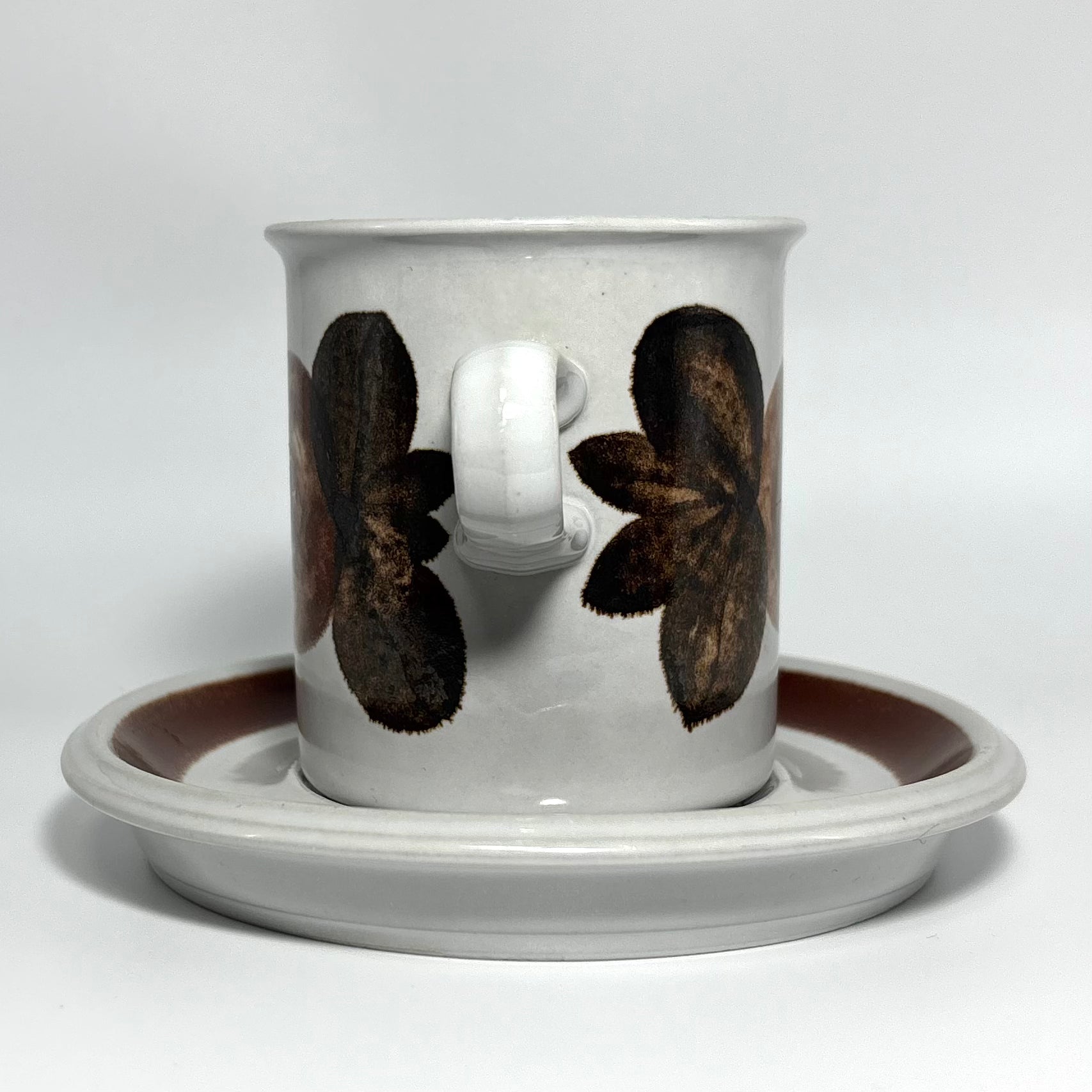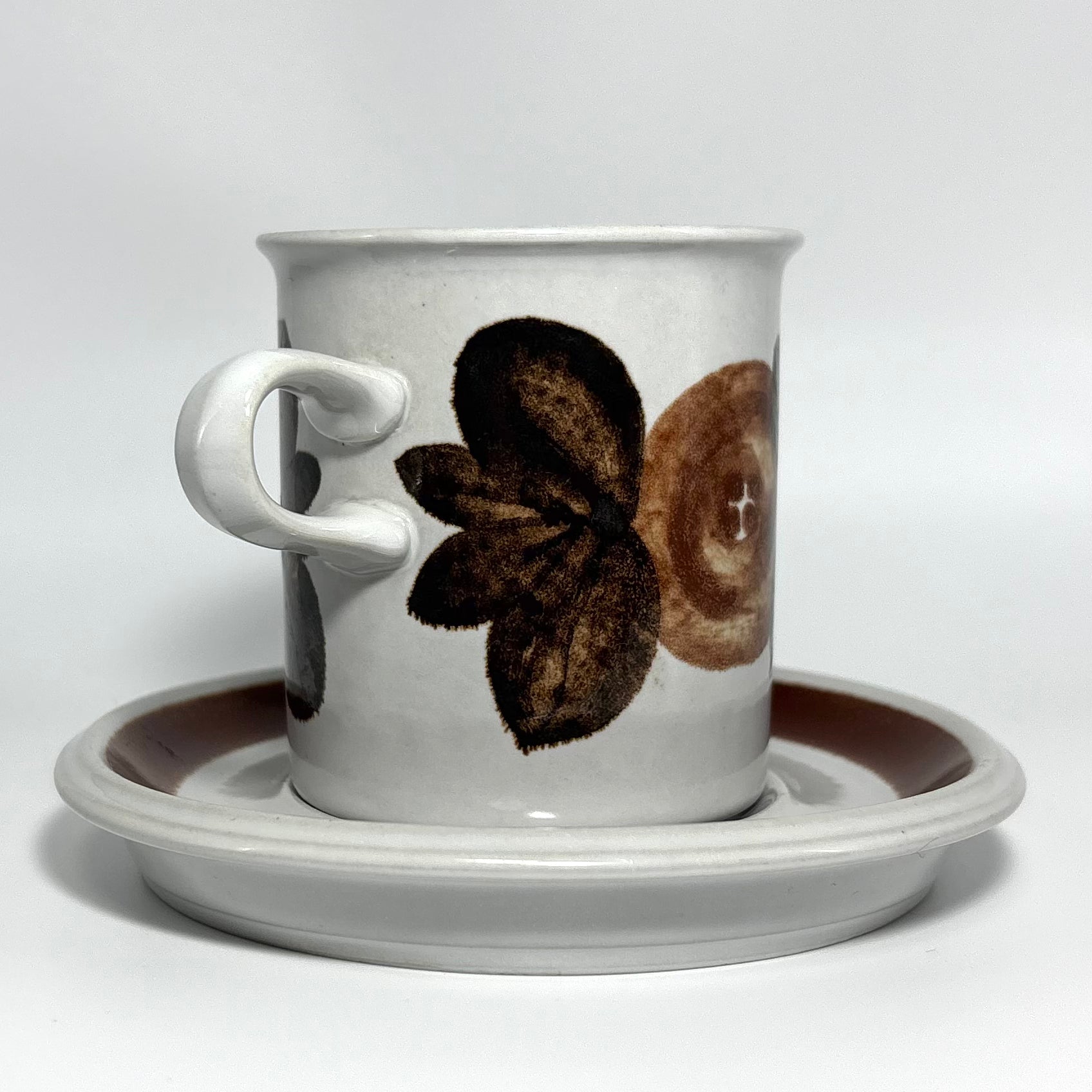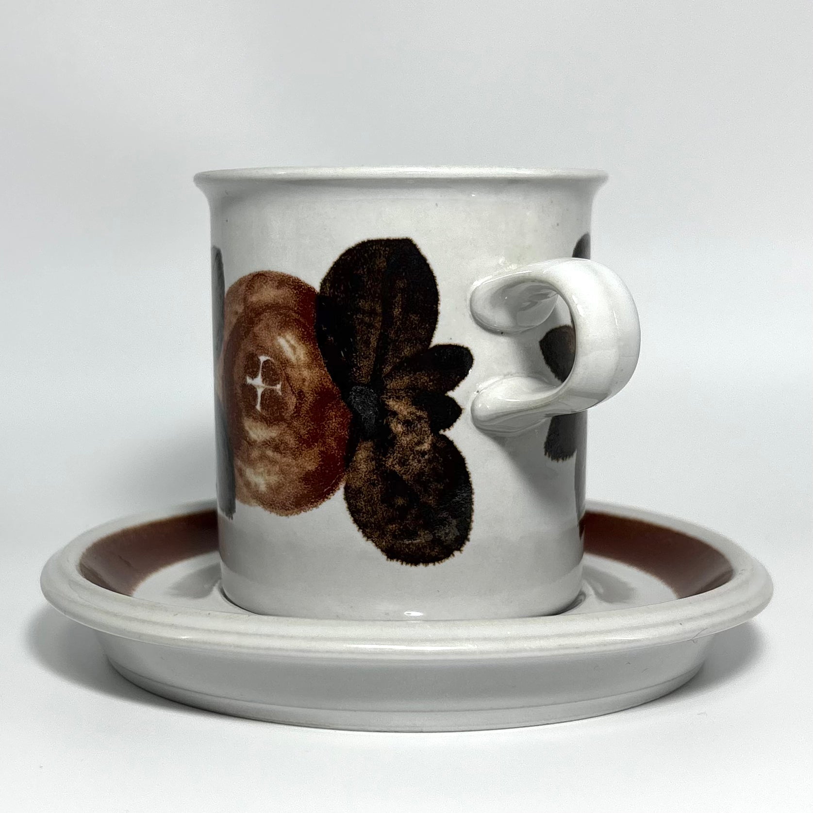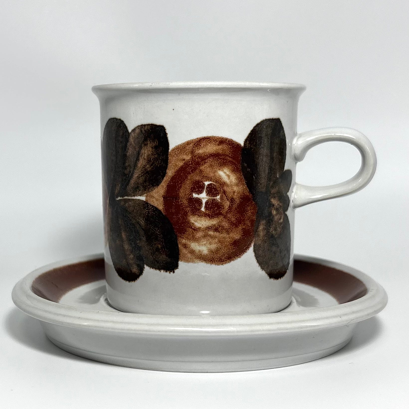 カップの側面に深みのあるブラウンの花が鮮明に描かれ、ソーサーのリム部分には均整の取れた濃淡のラインが美しく映えています。
