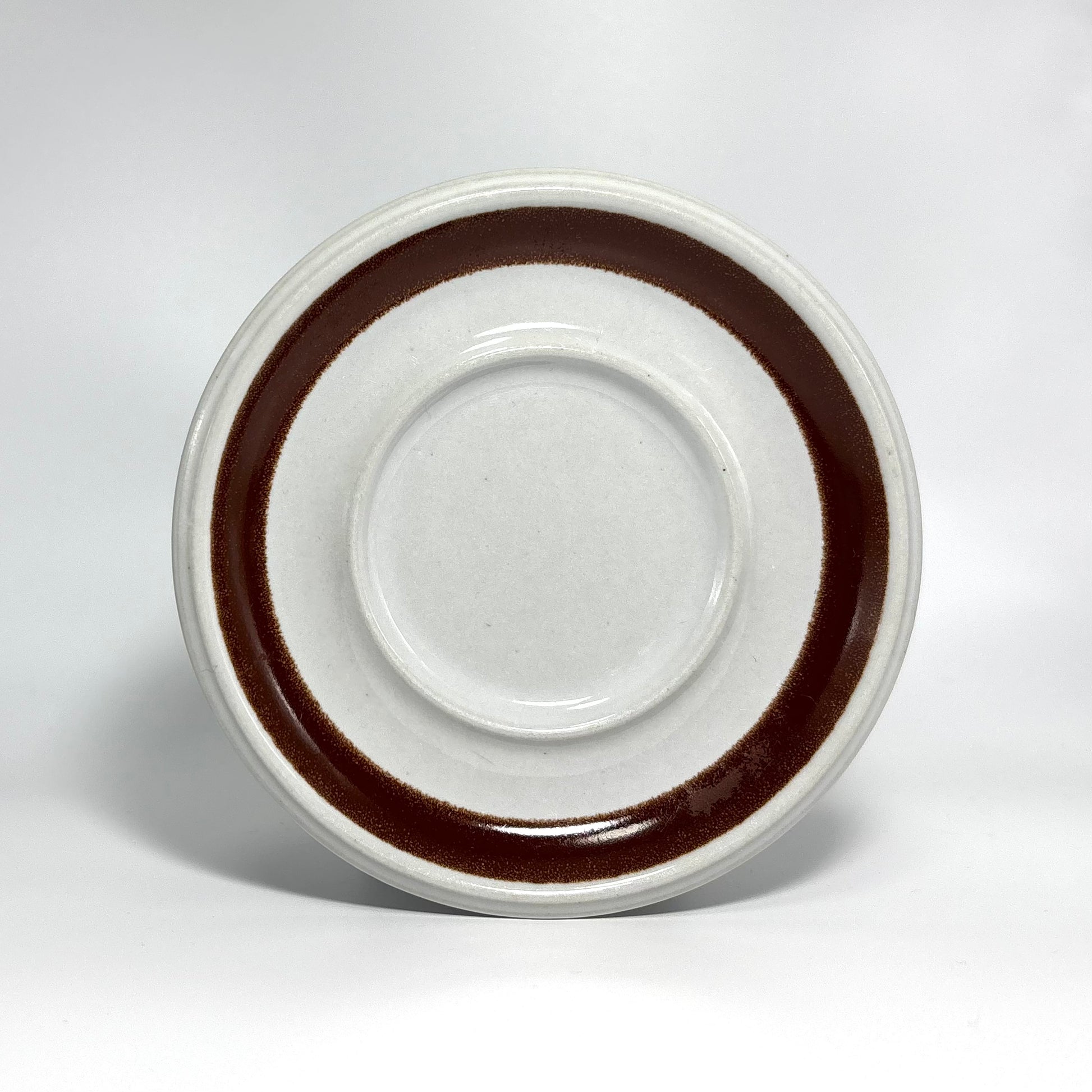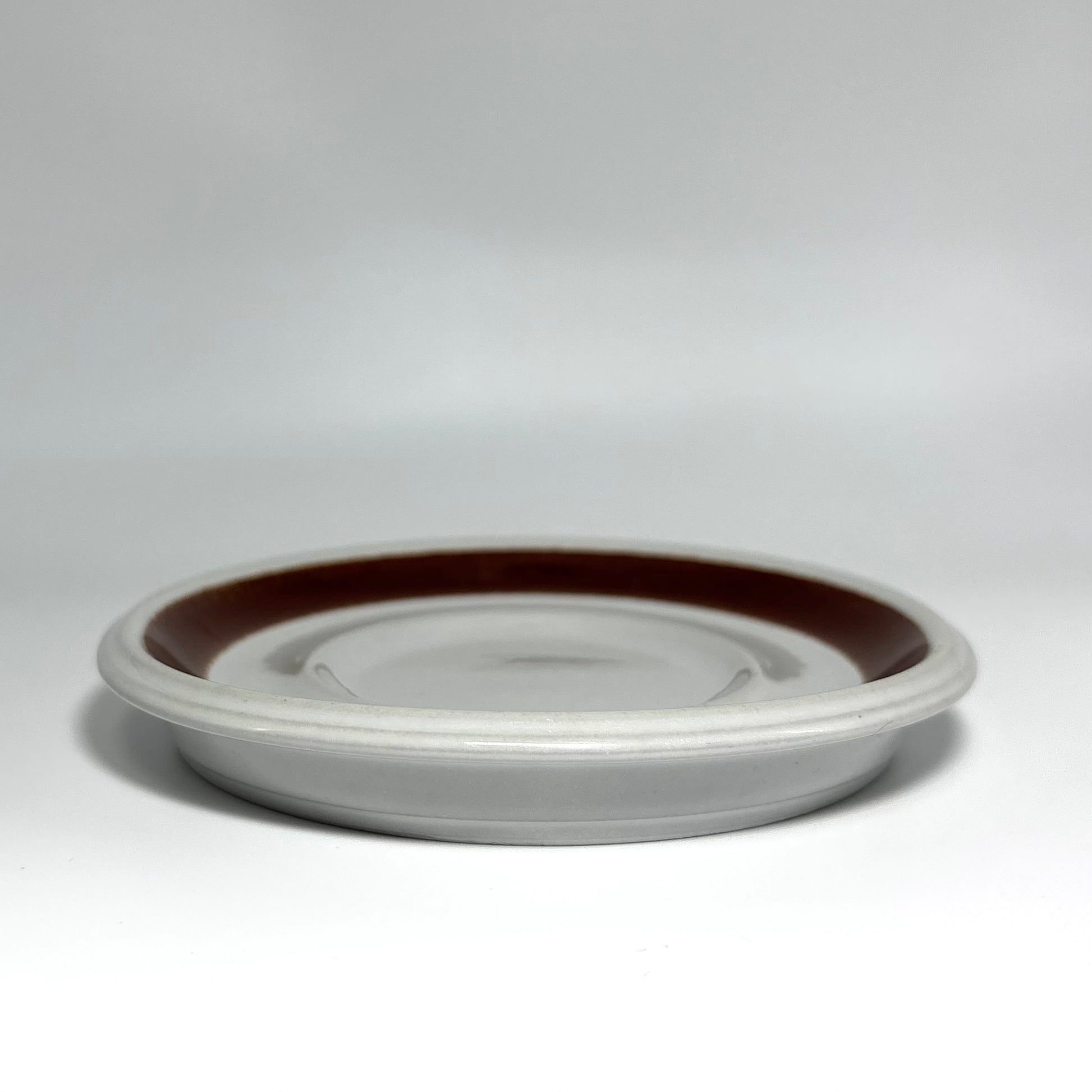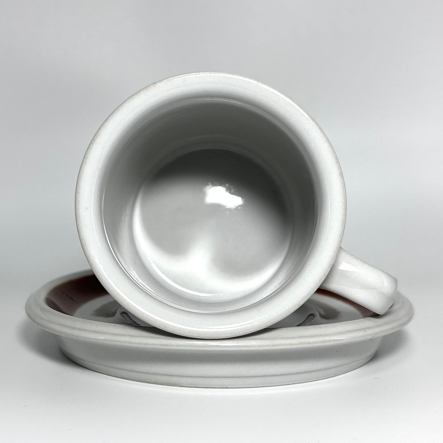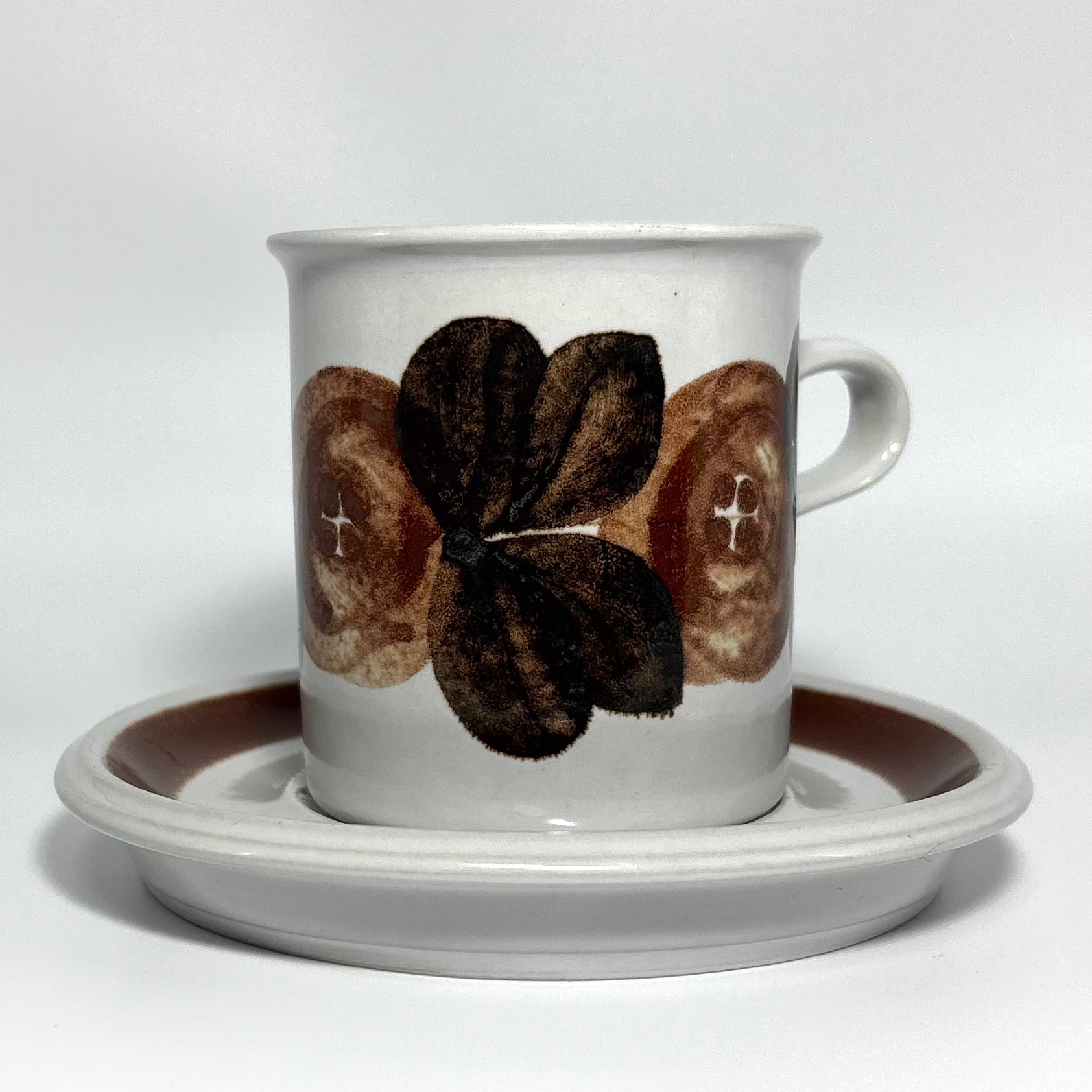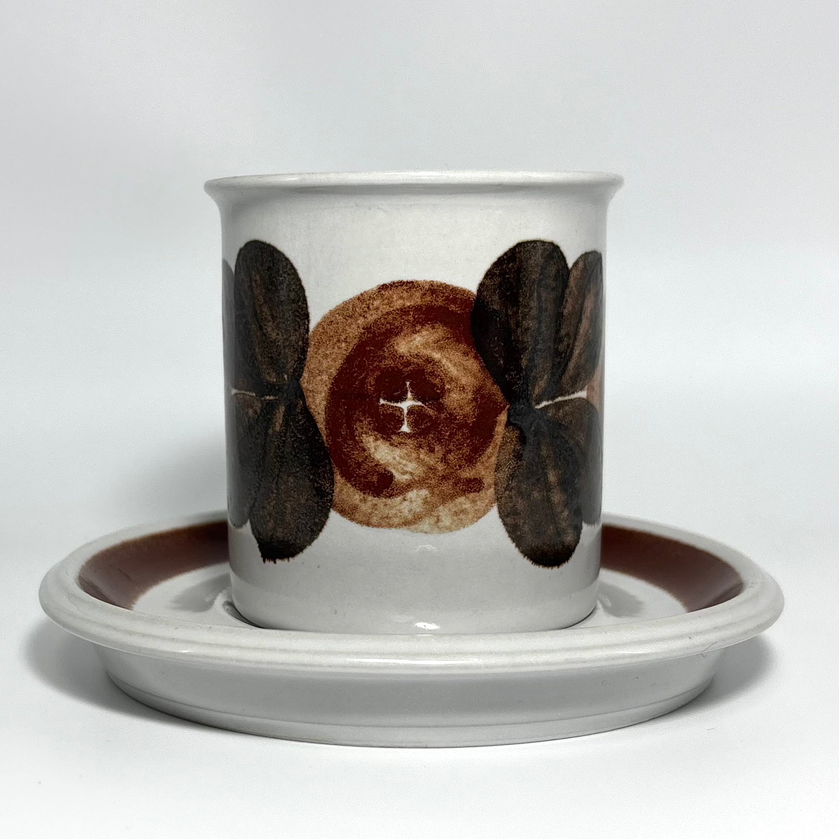 カップの側面に深みのあるブラウンの花が鮮明に描かれ、ソーサーのリム部分には均整の取れた濃淡のラインが美しく映えています。