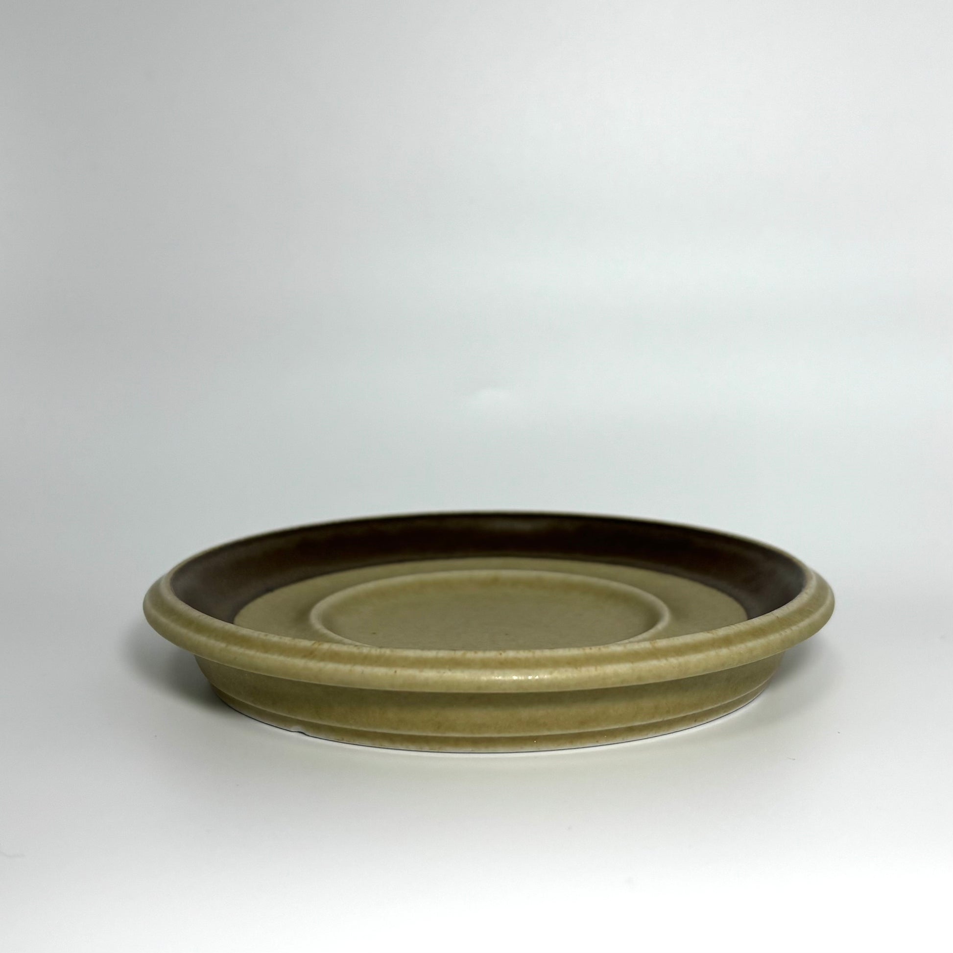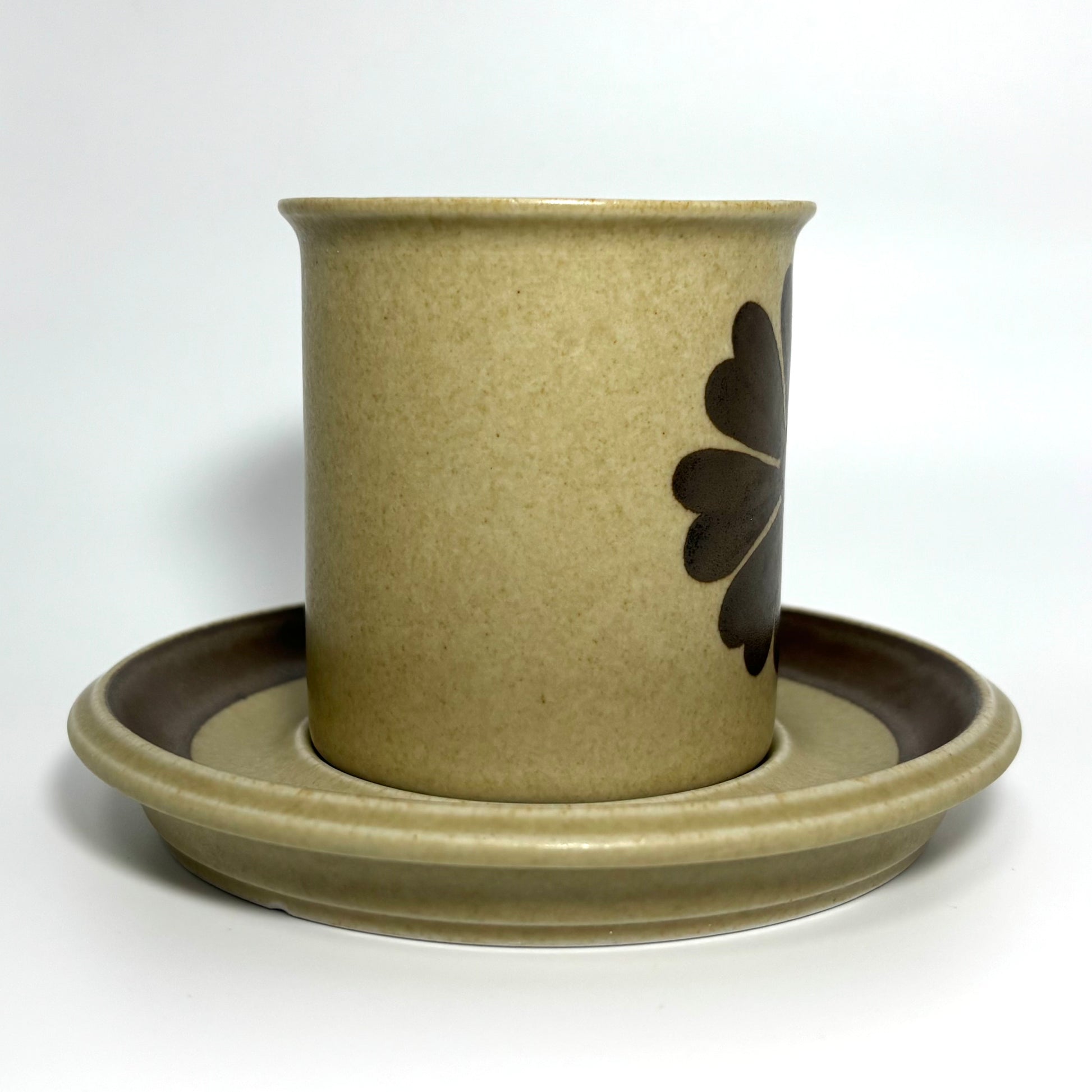マットなカーキベージュの素地に、ブラウンの手描きラインと小さな花のモチーフが添えられ、北欧の自然の静けさがそのまま器に落とし込まれたような佇まいです。